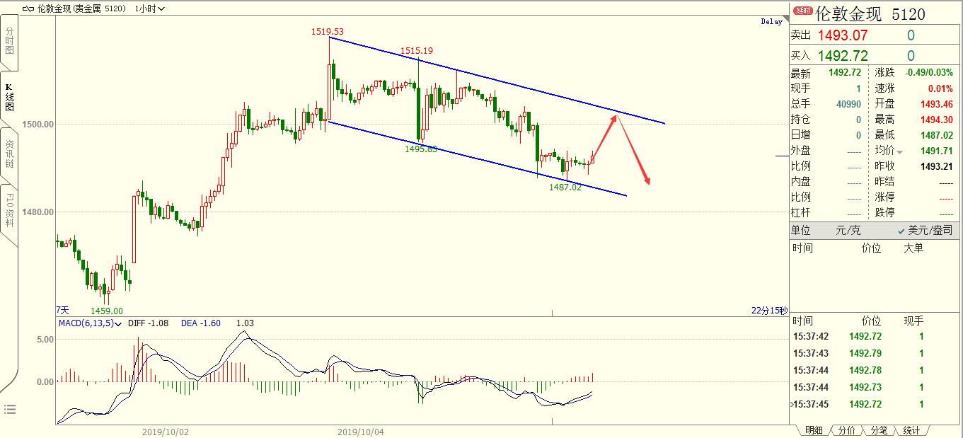你如果还是不能彻底地放过那些不属于你交易系统的机会,还是用侥幸寻找着成功,那么你将永远找不到成功。 而只有彻底的放弃,彻底的遵守,彻底的执行,才是你走向成功的唯一选择! 周四晚间十点,美国公布的9月非制造业数据不及预期,美股跳水,原油跳水,黄金趁机又拉了一波,最高到了1519.5。假期期间,有三个数据全部利好黄金,黄金从1459反弹到1519,振幅也有60美金了。周三1480的多单在周四顺利止盈。 伦敦金1480做多,目标1515。 美黄金比伦敦金高5美金。 周初的时候还倾向于反弹做空,但周三欧盘时段第二次站上颈线1480之后,思路开始倾向于日线