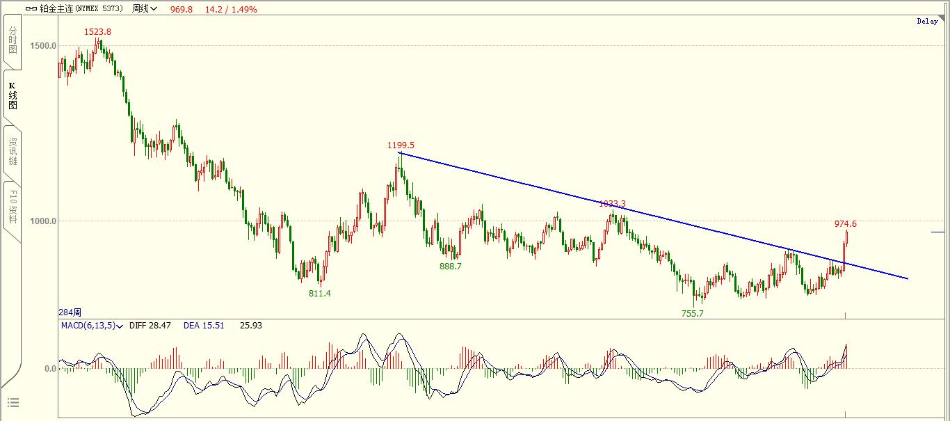 你如果还是不能彻底地放过那些不属于你交易系统的机会,还是用侥幸寻找着成功,那么你将永远找不到成功。 而只有彻底的放弃,彻底的遵守,彻底的执行,才是你走向成功的唯一选择! 今年,在美联储加息的大背景下,见识到了黄金白银的大牛市,白银做为后起之秀,也在努力赶超黄金。在贵金属品种中,钯金优先启动牛市,后面是黄金,白银紧随其后,最近铂金也开始崭露头角了。 上图是铂金月线图,图表上上个月月线收盘突破结构,周线上周收盘突破结构,大级别上的突破有效性比较高,可以认为铂金也开始进入牛市阶段。位置上,在十年低点,下方的空间已经被极度