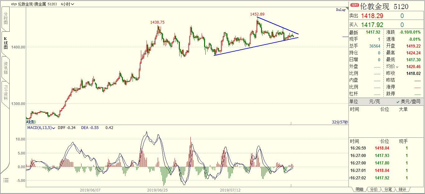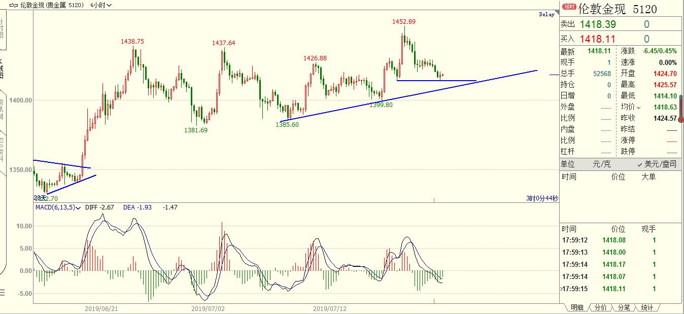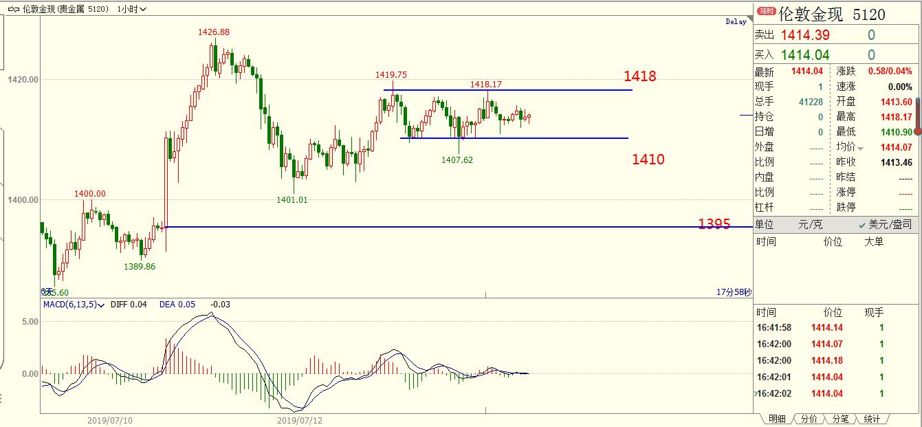 许多交易人不能(或不愿)去接受较小的亏损。他们常常是持有亏损头寸,直到已经伤筋动骨了,才被迫斩仓出局。这是没有节律的胡作非为:一个投资人应该研究出一套自己的交易体系并坚持不懈。 黄金,今天7/16号,月中了。黄金在月中的时候经常有大动作。7/10号的大阳线之后一直在等待做多机会,但一直没有合适的盘口,每一次多头进攻就被空头怼下来,这样看,黄金的多头已经错过了爆发力盘口。 图表上,黄金的波动空间一直被压缩,现在已经接近极限位置,1H图上在1410-1418之间震荡,预计今明天两天将会被突破。技术面上,如果1H收盘价跌破1410,金价有望去1395附