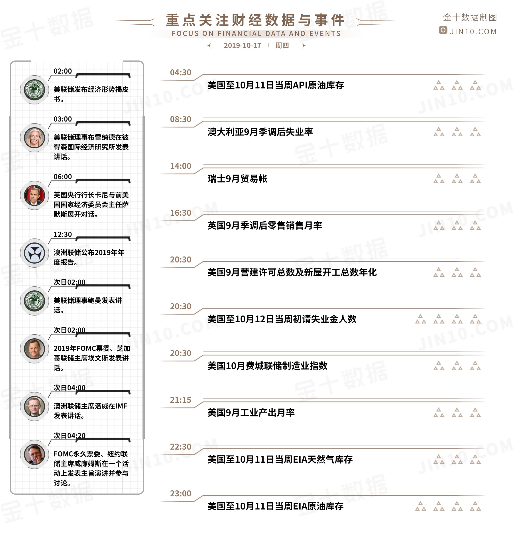起风的日子学会依风起舞,落雨的时候学会为自己撑起一把伞。震荡是时候学会耐心等待,单边的时候学会胆大心细,生活有望穿秋水的期待,也会有的意想不到的欣喜。低头要有勇气,抬头要有底气,平时要有骨气,获得的越多,就会越温柔,不会为一点失去就气得暴跳如雷,也不会因为别人的否定就变得愤怒又消极。好的成长,就该是让人变得越来越温柔。能力虽然会决定能得到什么,但格局却会决定最终能走到哪里。 【今日重点关注的财经数据与事件】2019年10月17日周四 ①08:30澳大利亚9月季调后失业率 ②12:30澳洲联储公布2019年年度报告 ③14:00瑞士9月贸易帐 ④16:30英国9月季调后零售销售月率 ⑤20:3