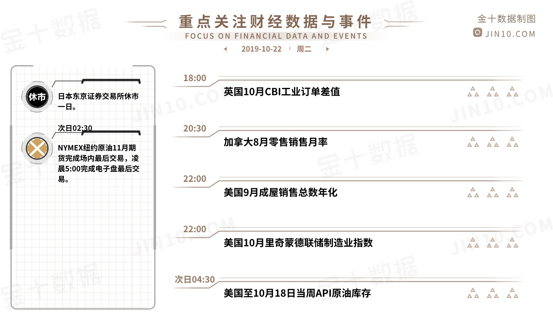 喧哗的白昼逝去了,世界重归于沉静,彼时,灯火似被点亮的星星一般,有次序的亮了起来。昼夜交替,新的一天总有新的故事,每一天都有不一样,都是一次新的起航。其实经历了什么并不重要,重要的是伤疤好了是否还能记得痛,毕竟这决定了往后的是否还会重蹈覆辙。顺境,可使生活风生水起;逆境,也能使生命别有洞天。在顺境里不惊不喜,在逆境里不卑不吭。应该时刻提醒自己:贪杯误事,有些酒浅尝辄止即可;贪心误人,有些行情适可而止为佳。 【今日重点关注的财经数据与事件】2019年10月22日周二 (日本东京证券交易所休市一日) ①18:00英国10月CBI工业订单差值 ②20:30加拿大8月零售销售月率 ③22:00美国9