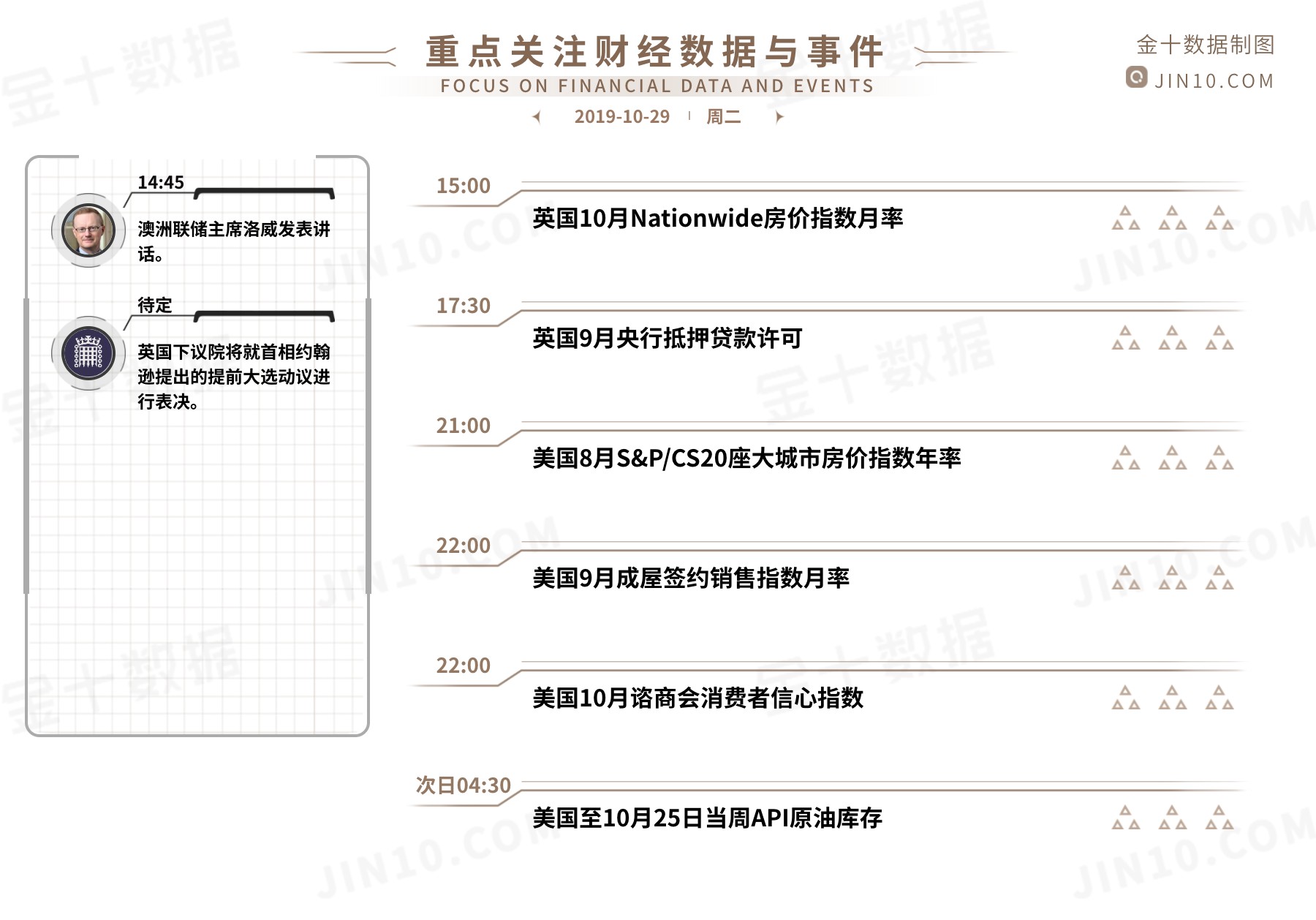 在你下定决心要努力奋斗的时候,你就该明白,你必须做到心如止水又满腔热血,你必须安安静静地去铺那条通往成功的路,这是一个很痛苦的过程,可当你拿到傲人的成绩时你就会明白,任何付出或多或少都会是有回报的 【今日重点关注的财经数据与事件】2019年10月29日周二 ①14:45澳洲联储主席洛威发表讲话 ②15:00英国10月Nationwide房价指数月率 ③17:30英国9月央行抵押贷款许可 ④21:00美国8月20座大城市房价指数年率 ⑤22:00美国9月成屋签约销售指数月率 ⑥22:00美国10月谘商会消费者信心指数 ⑦待定英国下议院表决首相的提前大选动议 ⑧次日04:30美国至10月25日当