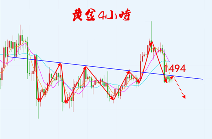 遇人不淑、择师 不慎、逆势扛单,你是否觉得投资这条路太过艰难,亏损总是格外容易,盈利却难如登天?同样是投资为什么盈利的人不能是你?原因很简单,阅尽此文缘由你便知。 (交流方式见文末) ====无技术谈何盈利?==== 从日线来看,K线已跌破布林带中轨以及一众均线的支撑点,不过布林带三轨继续缩口,MACD快慢线也依旧粘合在O轴的位置,表明 黄金 大趋势还是处于布林带之内的来回震荡,如果今日黄金继续走跌,那么下方1480一线将成为强劲支撑点。 从4小时来看,由于昨日的走跌,目前也是处于双死叉下跌形态之中,K线跌至一众均线之下,布林带下轨开口,如果早盘黄金跌破1490美元,那么
