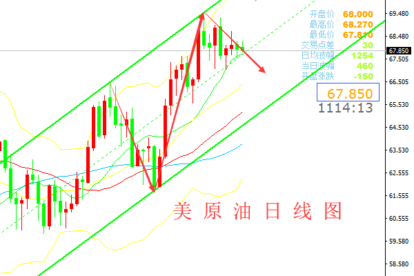 4月30日美原油行情走势解析 周五录得一根上长影线中阴线,油价未能延续前一交易日多头收阳行情,多头行情被重挫。目前日图上来看,布林带开口上行,MA5均线与MA10均线呈金叉继续上行,K线收在布林中上轨间MA10均线上方,MACD快慢线位于零轴上方运行且快线拐头下行欲有与慢线交死叉之势,红色动能逐步缩量,KDJ三线初交死叉
