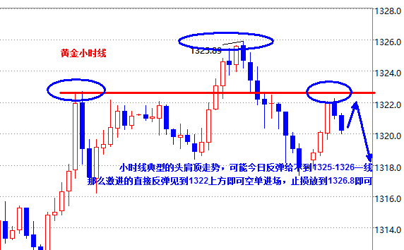 1.伦敦金方面首先我们看小时线,今日在早间开盘于1318一线后于亚盘时段连阳上冲,最高试探到1322-1323一线的肩线位置,在这个位置我们也是多次提到可以操作空单,因为文章发出来比较晚了,所以比较可惜,没有操作到,后期接近三波机会都没能给到1322上方的点位,目前上方短期压力依旧是在头肩顶肩线位置,1322-1323,今日整