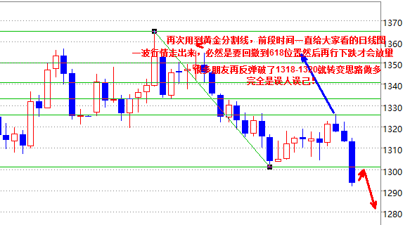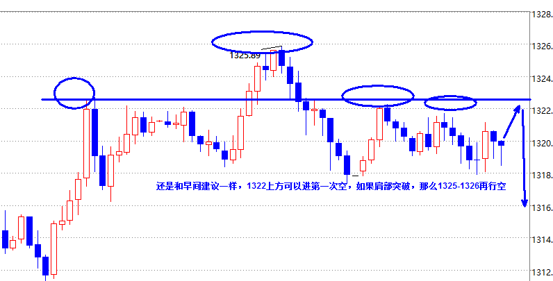 1.昨日冲高回落1318失守,根据顶底转换现在的1318成第一压力做空区域。昨日我这边一直在强调头肩顶,肩线位置1322-1323做空,行情也是如预期下跌,于昨日尾盘时段跌破1318短期支撑,最低试探到1313-1312附近,今日黄金开盘于1313附近,亚盘时段在1313-1314小区间震荡之后再次刷新低点最低试探到1310-1311区域,可能很多朋友