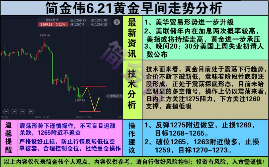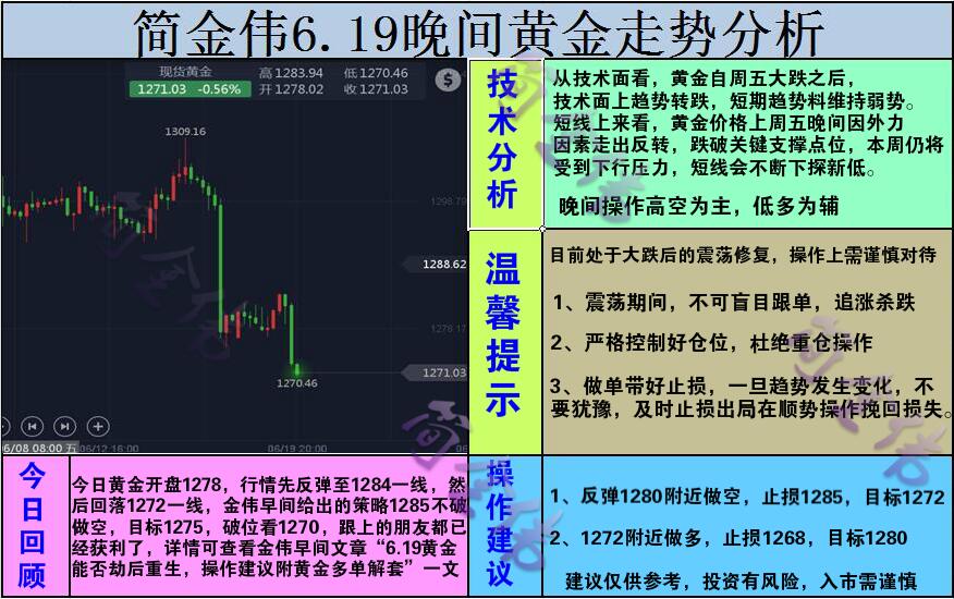 成长之路难免会有磕磕碰碰,投资之路也总会有盈盈亏亏,不以物喜不以己悲,调整好心态。贵在持久,胜在坚持! 日内黄金呈现震荡下行趋势,开盘后反弹1284一线后下行至1270一线后反弹,前期大跌使得近期趋势更加倾向弱势,目前未能完全止住跌势,短期黄金会在震荡修复中不断下探新低,短期内仍然关注上方1285一线阻力,下方重点关注1270一线破位情况,不破可在1272附近做多,破位则会进一步打开下方空间,黄金或将回落至1250一线,淫才操作上稳妥起见,高空为主即可。 黄金在不断刷新年内新低的同时,市场上是一片愁云惨淡,无数人被机构清仓血洗,剩下的也在行情的震荡下瑟瑟发抖,目前整体