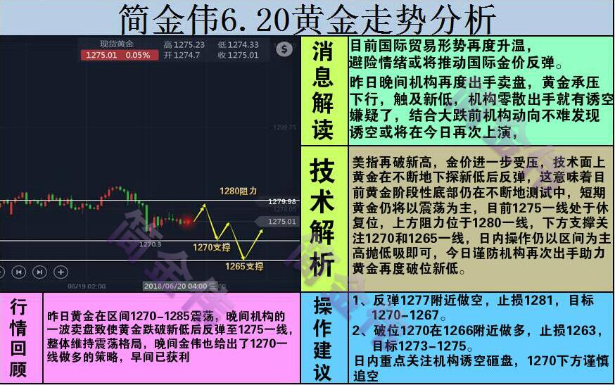 表面的平静掩盖不住内心的亏虚,口头上说不在乎,只不过是掩饰,行情的变化充满刺激与风险。仿佛人站在悬崖边上,一只脚悬空,一只摇摇欲坠,稍有不慎,必将跌入万丈深渊。做投资同样如此,不必掩盖自己的过去,善于总结过去才能更好的重新开始。 今日行情解析 趋势的下跌后,表现了明显的动力不足,短线上金价成功站在均线上方,结合大跌之前机构做法,不短的试探上方新高,给出明显的诱多信号后暴跌,那么现在我们应注意在机构助力下黄金将不断的下探新低,诱空过后市场将迎来一波反弹。因此操作上谨慎做空,高抛低吸,上方关注1280一线阻力,下方关注1270一线支撑。重点关注日内1270破位情况。破位日内支撑看1