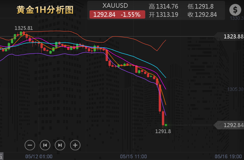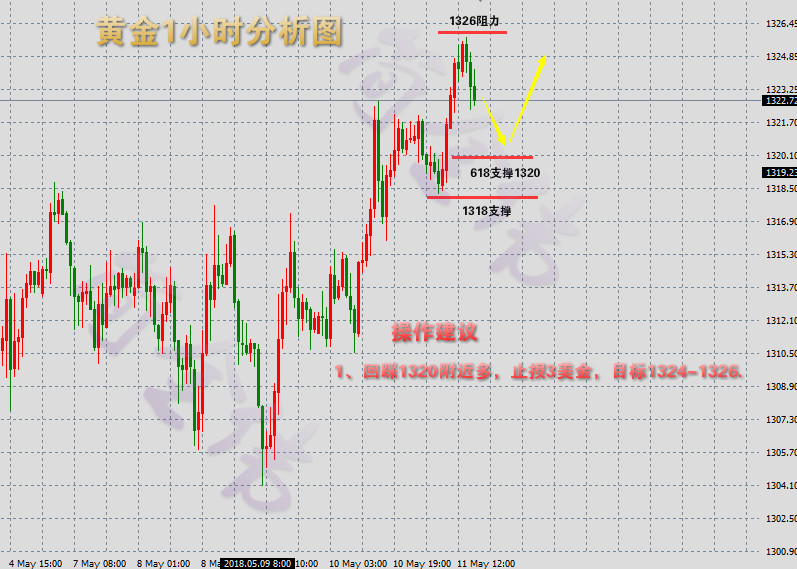 随着近期中美贸易摩擦缓和、美股上涨引领风险情绪回归,美国高官发言助美元再度飙升,今日凌晨黄金曾一度下跌7美金,今日晚间则需重点关注美国4月份的零售销售月率,这一被称为恐怖数据的数据或是黄金短期走势的助推器。 技术面 昨夜晚间2点做左右黄金跳水,回撤618黄金支撑位1312附近,从1小时线来看,布林带开口向下,均线