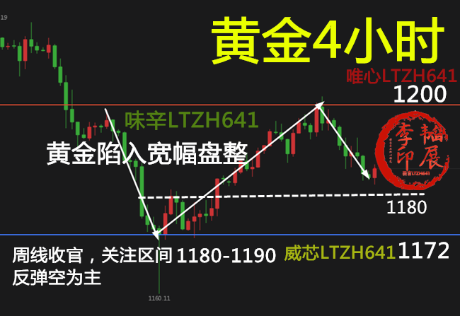 简单的行情交给不懂的人去做,也变得复杂;复杂的行情交给专业的人做,也变得简单。世界上最遥远的距离不是生与死,而是行情就在你面前,利润向你招手,你却只能眼睁睁看着一次又一次与你擦肩而过。世界上最遥远的距离不是你对行情感到无路可走,而是你执着于抄底的路上来回被套追涨杀跌,我在1166喊多,1180喊多,1191继续多。千万不要说行情在玩弄你,因为它并不了解你有多少资金,不了解你的性格与脾气,只有摸清它的脾气与规律,它才会屈服于你。 上周黄金市场后半段的表现并不是很好。价格围绕1200来回争夺,周线收于小阴。而在前一周行情当中我们韬展魏~新Ltzh641强调周线在连续下跌鉴于20周以后。是一个垂直