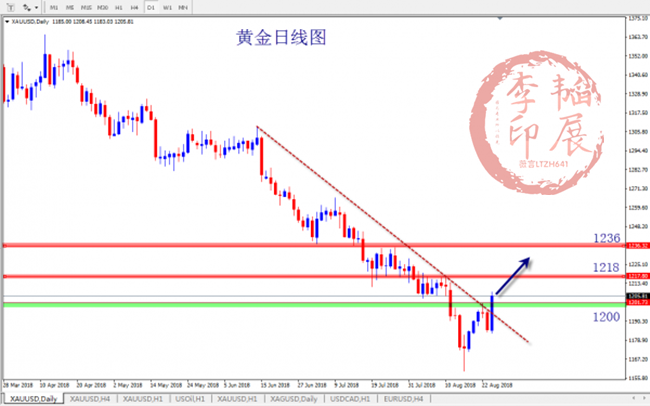 行情再大,不属于你,就永远不要勉强;机会再好,你看不懂,就千万不要强求。我是李韬展,那个引领方向的人! 上周国际黄金伦敦金,在连续六周下滑之后实现首个单周上涨,并一举突破1200美元/盎司重要关口并收于在此上方,虽然在周中美联储纪要给美元提供支撑,但在周五美联储主席鲍威尔在杰克逊霍尔央行年会上的偏鸽派言论以及外界围绕特朗普可能遭到弹劾的猜测将引发对避险资产的需求,令美指从20日线上方大幅回落,再次之后金价大举反弹,一举攻克1190及1200两大关口,美市盘中最高上探至1208.13美元/盎司,当周收盘报1205.55美元/盎司,上涨20.63美元,涨幅约1.8%。 展望本周,美墨两国有望最早