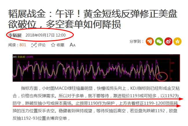 如果你在投资路上正处于亏损,不妨把我设为关注;如果你已经观察一段时间,不妨跟我聊聊;如果你有什么顾虑,不妨跟我直接联系;如果已经考虑清楚,不妨一起合作!你我本陌路,日久见人心,力所能及处,处变不惊时,时不待你我,我是李韬展,那个引领方向的人! 9.4昨日黄金操作回顾 黄金,周二的行情再次跳水,再次走了一波黑天鹅,我们昨日的交易思路,很完美,早盘1200空单,欧盘前1194盈利离场,加上美盘后在1193布局的空单,在凌晨1190落袋为安,接近有10美金左右的利润。 9.5黄金亚欧盘行情解析 日线图显示,现货黄金目前已经再度跌至1200美元整数关下方,金价或已经打开了进一步下行的空间。技术指标目