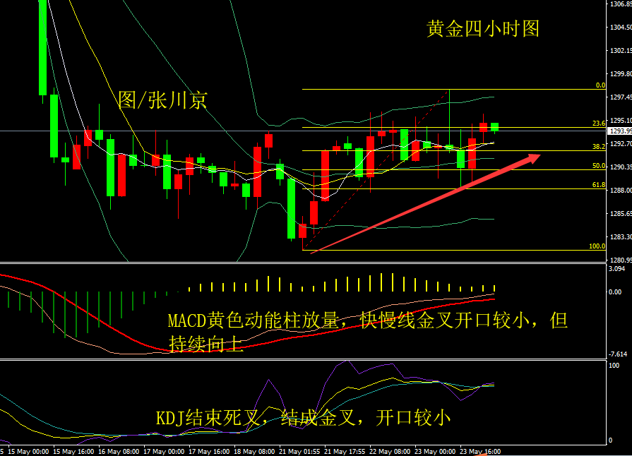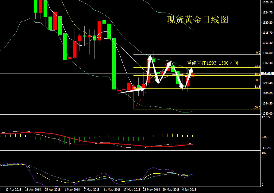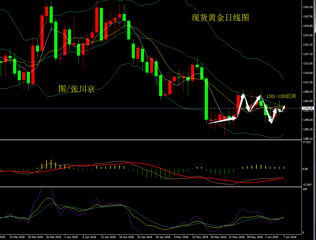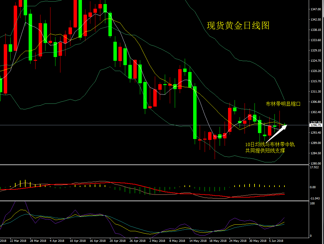 张川京:黄金 K线日日拔高,似在平淡行情中蓄势 本周的黄金走势,实在是没有特别出彩的地方,表现的平淡无奇,金价连续第三天维持震荡,千三关口形成主要压力位置。本受市场消息相对清淡,上周非农数据的影响也逐渐减弱,美联储加息逐渐进入市场的视线当中。随着美联储 6月议息会议临近,市场对于美联储下半年的政策走向分歧将加大,且外贸易战议题仍是影响金价波动的一个重要因素,黄金未来的不确定性依旧较大。 现货黄金分析 日线图来看, 布林带 明显 缩口运行, MA5均线呈死叉向右走平, 长上影线极小实体 K线收于布林中下轨间MA5均线附近 ,近日 K线下方低点在提高,上方高点在突破,有回暖趋势;现金价