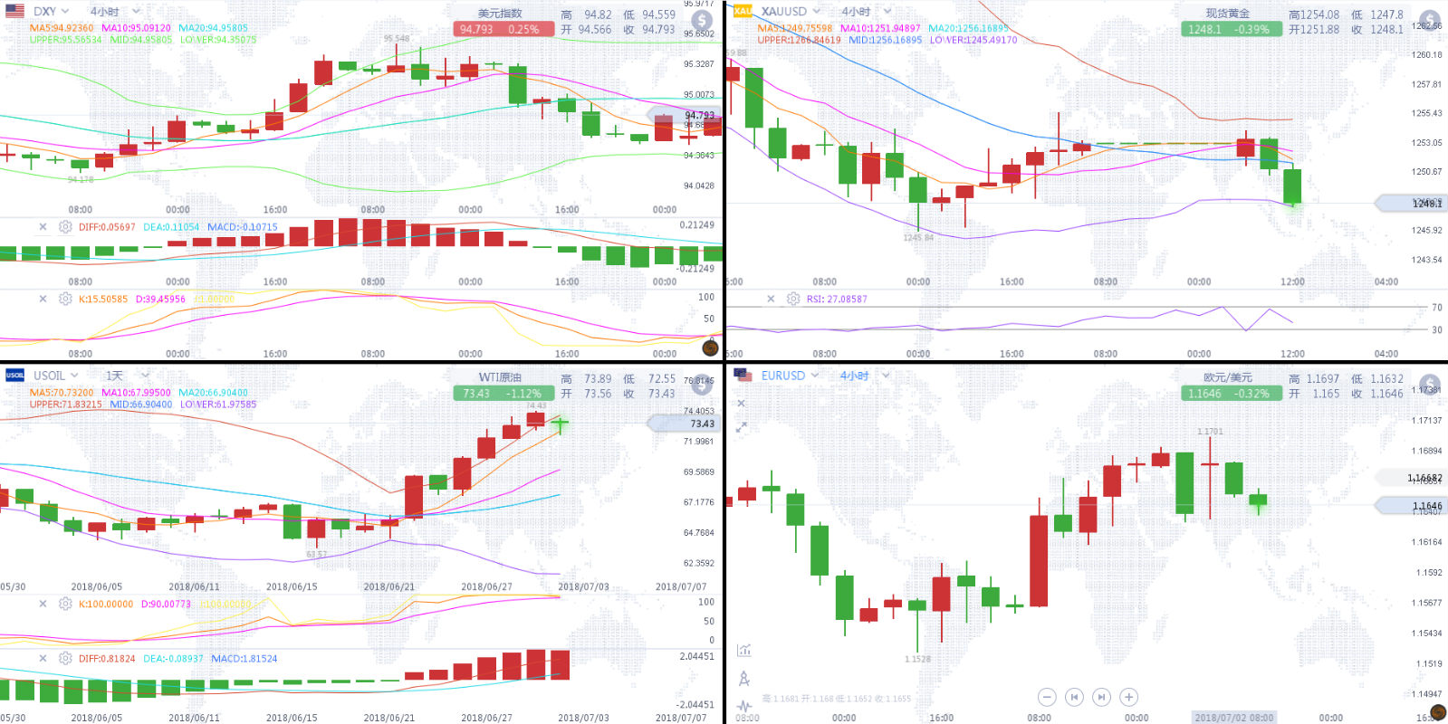 周三 (6月6日),美指震荡下行,一方面 美联储 或鸽派加息,另一方面由于 欧洲央行 官员鹰歌嘹亮,暗示可能于下周讨论退出宽松政策,因此 欧元 受到提振施压 美元 ,间接扶助黄金上涨,但 金价仍在千三下方震荡 ,只 因 目前 避险情绪温度 不够 。 后市避险情绪还有升温空间。一方面, 继加拿大、墨西哥之后, 欧盟委员会日内批准对向世贸组织通报的全部美国产品征收额外关税, 并 期望在 6月底前与各个欧盟成员国协调完成相关程序 ,以便新关税政策于 7月实施。 另一方面,虽对全球贸易战的担忧使得市场避险情绪有所上涨,但还不足以支撑金价的持续上涨需求。 G7峰会将于本周五召开,虽预期六国领导人将联手