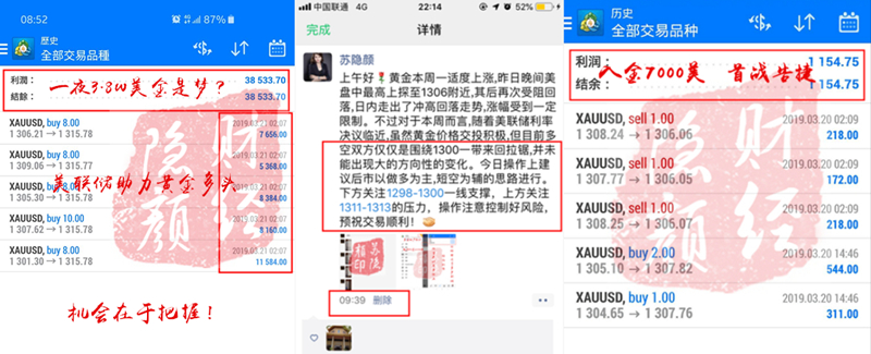 苏隐颜:3.20黄金美联储大戏即将上台,黄金低多10点利润到手! 在这个市场中,从来都是流水的人,都是来来又走走。但是不管是怎么样的人,最初的目标都是在这个市场淘金的。但是总是事与愿违,总是到资金亏完了,灰溜溜的退出这个市场。对于心有不甘的朋友,隐颜在这里说一下,做投资是长久的,而我们在投资的过程中要做好风险的把控,以及资金的管理,你一时的小亏,但是还有资金就还有机会,一时的得失也不能代表整体的得失。vx:syy7688 ——黄金震荡上升,如何操作才能稳健获利?—— 黄金后市操作策略:建议回调1303-1300附近多单,止损1297,目标1308-1310附近;触及1310-1312附近不破