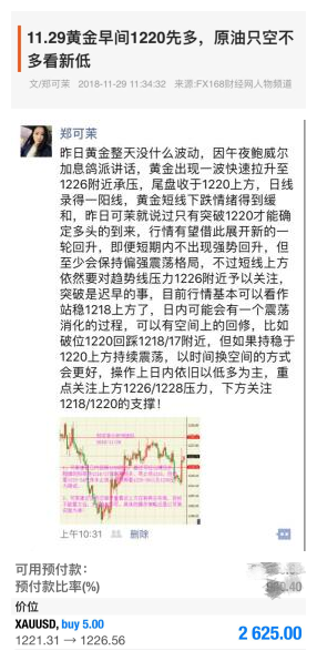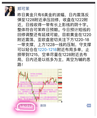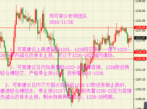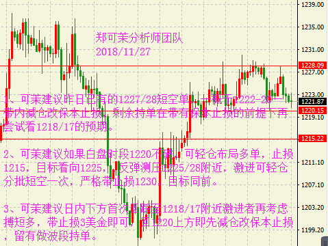 市场的风险来自于2个方面,一方面是未知和无法预知的消息面刺激或者是主力砸盘,另一方面是交易规则自身,而交易规则自身的风险是可以提前和自行控制的,比如说严格止损,不重仓读!而未知和无法预知的消息面刺激风险只能躲避或者用交易规则来规避! 黄金行情分析及操作策略: 亚欧盘黄金震荡走高,早间可茉就在朋友圈以及博文说过,1226突破是迟早的事,行情完全符合可茉预期,目前已经突破昨晚高点1226,最高到1227附近承压,早间在朋友圈以及博文公开喊单1220附近做多,可能没人拿着准都是1221-1223附近做的,又是一波不错的利润哦,稳健多单可以先出!目前短线1228一线存在一定的压力,1230是后市关键
