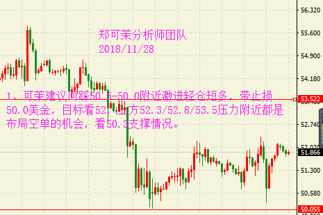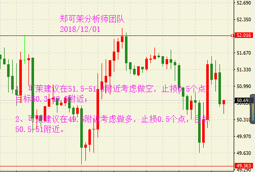 原油整个11月延续了10月初以来大跌的走势,因美国对伊朗原油进口实施了制裁豁免,导致原油供应过剩的担忧情绪明显回升。与此同时全球经济增长放缓,沙特、俄罗斯和美国原油产量维持在历史高位,库存增加供给大于需求的供给关系继续承压油价。下周OPEC将召开维也纳会议,此次会议上将再次讨论减产事宜,具体的减产数据多少将成为市场关注的焦点。如果减产数据超过市场预期预计将提振油价的可能性较大。 原油下周行情走势分析: 周初时段有效反弹,未能守稳在52上方,随后便再度转向回撤,周尾盘下行又一次刷出新低,整体盘面表现非常弱势,不过也可以明显看到,空方在临近49低点时有所支撑。但是在整体弱势的情况下,弱势短期难以