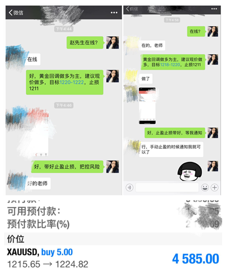 市场永远在多空相互博奕中进行,行情时儿强势上攻,时而急速下跌,你无法控制市场的走向,我们唯一能做的就是保住本金,当行情不明朗时可以将手头的单子出局观望,没必要因为不明行消耗自己的精力,行情是上还是下?最重要的要担心的是你将采取怎样的对策回应市场的变化,当你正确时,你能获得了多大的利润,当你错误的时候,你能够及时的规避。 可茉一直都在强调趋势的重要性,在趋势面前,只有顺应趋势才能获利!周五黄金日内多空通吃,具体看一下可茉日内的做单情况! 第一单: 可茉亚盘在朋友圈以及博文给出了明确的看多思路,欧盘前可茉果断通知实仓朋友在1214一线布局多单,随后黄金上扬至1218一线承压,而咱们的多单也于此获