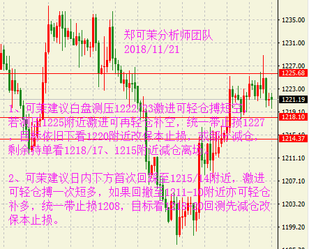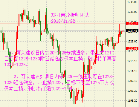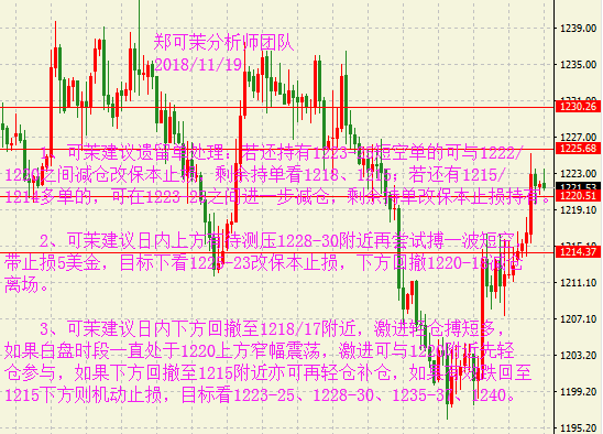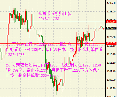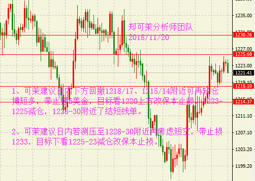 早盘黄金小幅走高后出现了一波快速回落,但总体走势中性偏多,维持在1220美元上方,因近期美联储偏鸽的讲话以及市场避险情绪的持续发酵。考虑近期多空因素交杂,预计黄金将横盘整理至感恩节前,但随后或选择方向。油价窄幅震荡。临近美国感恩节假期,市场相对交投清淡,尽管OPEC减产的预期令油价四连阳,但仍未出现大幅反弹,因俄罗斯方面对此仍处于观望状态。此外,投资者不再相信原油供应紧张的风险,令净多头头寸大幅削弱。 黄金行情分析: 昨日黄金延续上周五的偏强格局,采取居高震荡的方式运行,日线再收得一小阳,虽然未获得太多的回升空间,但整体运行状态符合预期。日线结构上,目前黄金基本可以确认下方多条均线的支撑有效
