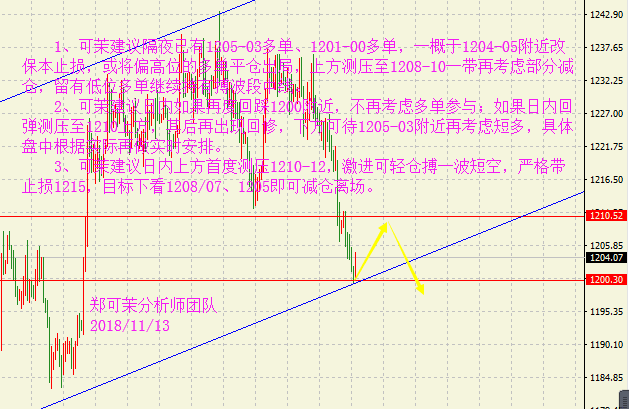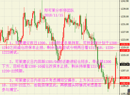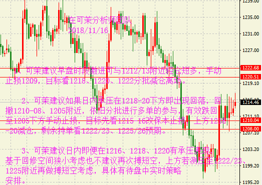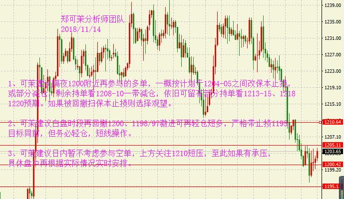 周四早盘黄金价格小幅下挫。因美元走软、油价反弹等积极因素共振,周三(11月14日)金价创两周来最大单日涨幅,最高升至1216.65美元/盎司。几经波折后英国脱欧协议草案获得内阁支持,近日需留意具体内容披露,议会投票预计在12月进行。目前大多数官员持保留意见,甚至有消息报道称强硬脱欧可能在今天发起不信任投票,英国仍难言进了政治保险箱。晚间将迎来具有“恐怖数据”之称的美国零售销售数据,市场影响较大,需要重点关注,目前技术面多空都有机会,任何一方取得优势,都有望为未来一周走势定下基调。 黄金行情分析: 行情来的比较晚,但终不会缺席!昨日黄金如预期位于低位震荡,此前1200的跌破显然给市场带来了很大