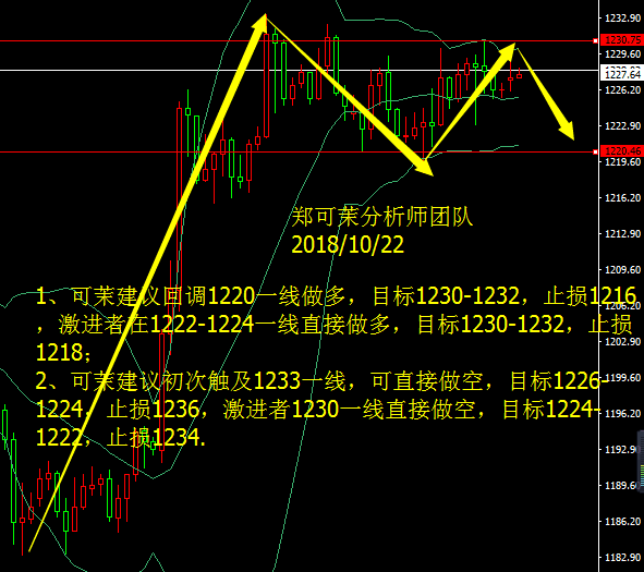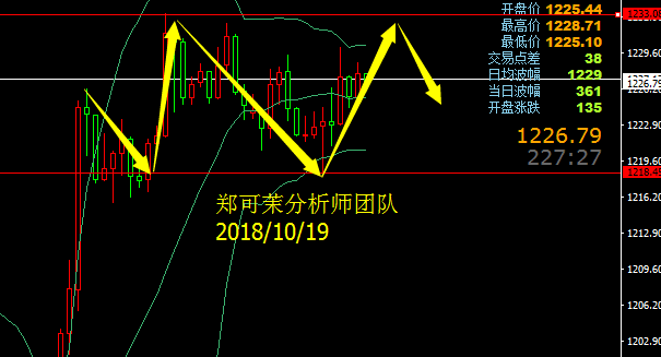 消息面解析: 股票作为一种风险性资产,近期全球股票暴跌,美股在本周依旧未能走出颓势,以纳斯达克指数为例录得周线三连阴,与黄金形成鲜明对比,另外本周欧盟峰会,意大利与欧盟矛盾再次激化而英国脱欧进展也十分缓慢。当然最主要的是沙特记者卡舒特失踪事件进一步发酵,此前特朗普称不会因此停止向沙特断供军火,因其还可转向俄罗斯。有分析认为,这件事最终或将演变成两国共同寻找“替罪羊”以转移舆论焦点,外媒称,特朗普未来将面临一场“金钱与道义”的艰苦抉择。目前,美英法等国财长已宣布退出沙特投资峰会。 黄金下周走势分析: 首先我们依旧回顾本周黄金整体走势,黄金上周可以用一个“震荡”来定义,整体走势还是在1218-1