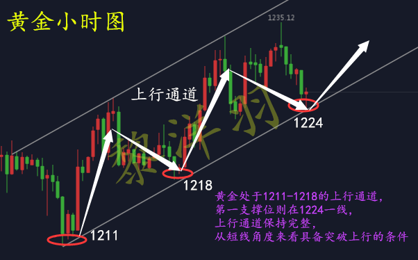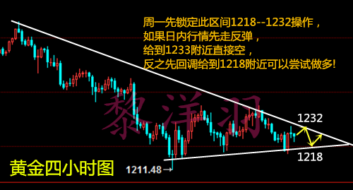 黎洋羽:周线收官黄金震荡偏多,亡羊补牢及时解套 没有完美的操作,也没有神准的策略!市场就是这样,变化多端,今日暴跌暴涨的行情,目前黄金已然回归平静!说实在的,在黎洋羽的观念里,想要在这个市场中获取稳健的盈利,“成功=机遇+准备”这个公式必不可少!为什么呢?所谓时势造英雄,英雄造时势!各位投资朋友们,赠君一法决狐疑,不用钻龟与祝蓍,我是黎洋羽,但愿人长久。 ===今日黄金整体行情看震荡 黄金再次承压1235一线进行回落至1221一线,从四小时看,黄金在1236形成双顶形态后之后快速回调,只是金价仍然处于1211-1218的上行通道,第一支撑位则在1224一线,上行通道目前还保持完整,从短线角度