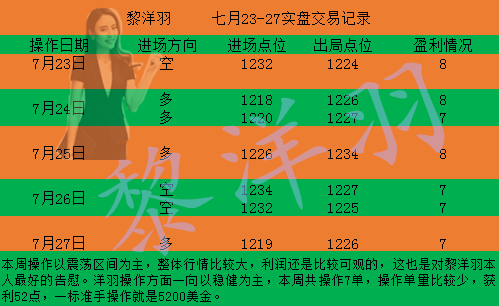 黎洋羽:黄金七单即获利52点,非农周百点利润唾手可得! 周末本该是放松的日子,但是有些事情却让人轻松不起来,比如说交易不顺利啊,比如说单子又被套住了。每到周末,洋羽都习惯对一周进行复盘,这让客户了结操作情况,同时自己也可以总结一周交易中的一些问题,也对下周的行情做一个展望。行情涨涨跌跌都能创造利润空间,关键是要能把握住,每一波涨跌都是有原因和规律的,只要思路正确了,做好交易并不是什么难事。 本周交易洋羽主要以震荡操作为主,单周的交易收获也比较令人满意,很多时候,我们看准了行情,就要坚决的做进去,一旦犹豫,就会错过该获得的利润!七月即将结束,八月非农将至,又是一波大行情等着我们。 ===周一行
