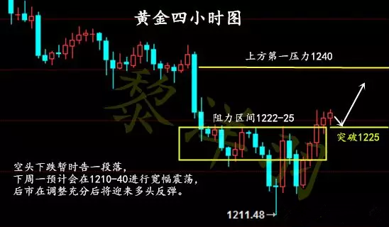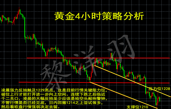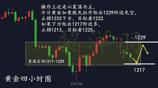 黎洋羽:今日黄金1217上方随意做多,多空单被套如何解? 相聚,却来不及牵手,相识,却来不及一起。流转的时光,照一脸的沧桑,就如昙花一现,来不及细细回味,每个人都有一段悲伤,想隐藏却又欲盖弥彰。就如阴阳K线间的博弈,稍有迟疑就会错失良多,回头不是精彩就是遗憾,下一秒在哪依旧是个迷,可这正是投资之乐趣所在。 ===今日黄金震荡偏多,1217上方任意多! 黄金日线最终收线在了1224的位置后行情以一根上影线很长的大阴线收线,而这样的形态收尾后,上周连续两日的反弹形态被抑制,但周线拉升形态并未破坏,首先是空头趋势并没有改变,然后1237一线位置太过重要,前期行情多次在这里反复之后才破位下跌,现在遇