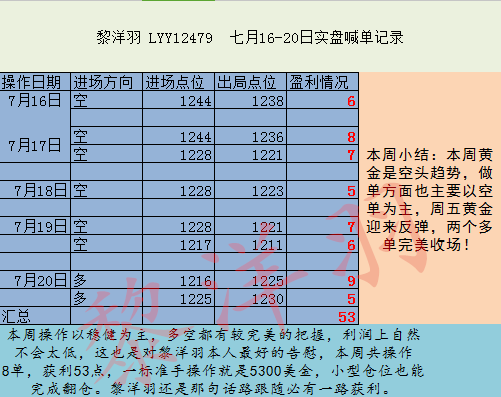 黎洋羽:黄金1245中线空大赚10W,后市再拿20点岂能错过! 大家好,我是你们的老朋友黎洋羽,洋羽认为一些朋友交易中经常存在一个误区,过于纠结点位和进场,很多时候对错不差那么一点,而错也只能是表明趋势的研判存在问题,而并不是位置。 从周末开始,洋羽一直坚持看空,并一直布局中线空单,十几个点轻松拿下,收获还不错。不知道你这边目前持仓情况如何?七月份转眼已经过半,行情这么明朗赚钱这么轻松,却没有拿到想要的利润,你有想过原因吗?我知道,在做投资的每一位朋友都渴望一路成功,其实我们做分析师的也一样,希望你们都能赚钱,这样才能实现我们的人生价值。 最近几天有位做的还不错的朋友跟我说,我的思路是跟你一