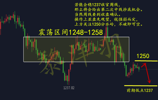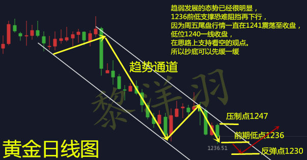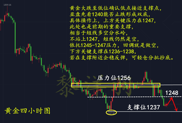 黎洋羽:美指守住94黄金还将下探形成双底,新一轮抄底布局 纽扣第一颗就扣错了,可你扣到最后一颗才发现,行情从开始看错,到了结束你才觉悟。有些事一开始就是错的,可只有到最后才不得不承认,思路决定了出路。时间就像流水,你永远无法触摸同样的流水两次,就像行情一样,不可能再重新来过,每一天、每一秒都是新的开始,也是旧的结束,把握当下,才能拥抱未来。 ====黄金还将下探形成双底 黄金日线图大阴柱回吐此前反弹,重新回到1240寻求支撑。此次触碰是第二次触及低点,若能企稳1237收官周线,那么将会给出第二次中线抄底机会。当然周线要到明天收盘确认,可以先看日线图的收盘,支撑强度有效的话,日线应该收盘在12
