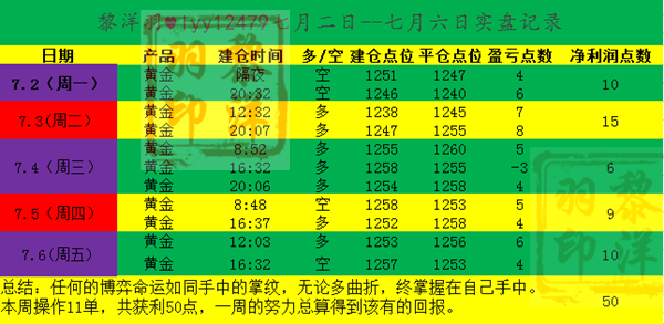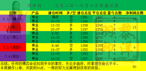 黎洋羽:非农利空黄金却不跌?诱多行情别进多!被套空单迎转机 又到周末了!无论,市场上涨还是下跌,即使,交易偶尔不顺,当发现在牵强的理由无法支撑原有的计划,唯一要做的不是闭上眼的坚持,而是懂得转换思路,这个市场唯一不缺的就是“奇迹”。各位投资朋友们,赠君一法决狐疑,不用钻龟与祝蓍,我是黎洋羽,但愿人长久。 ====本周交易总结,辛苦总有回报! 一周交易结束了,每到周末,洋羽都习惯对一周进行复盘,这让客户了结操作情况,同时自己也可以总结一周交易中的一些问题。本周黄金的行情比较反复,洋羽这边也能做到及时精准预知! ====非农利空黄金却未跌!诱多行情谨防跟进多单! 非农夜整体也就4美金的行情,这一