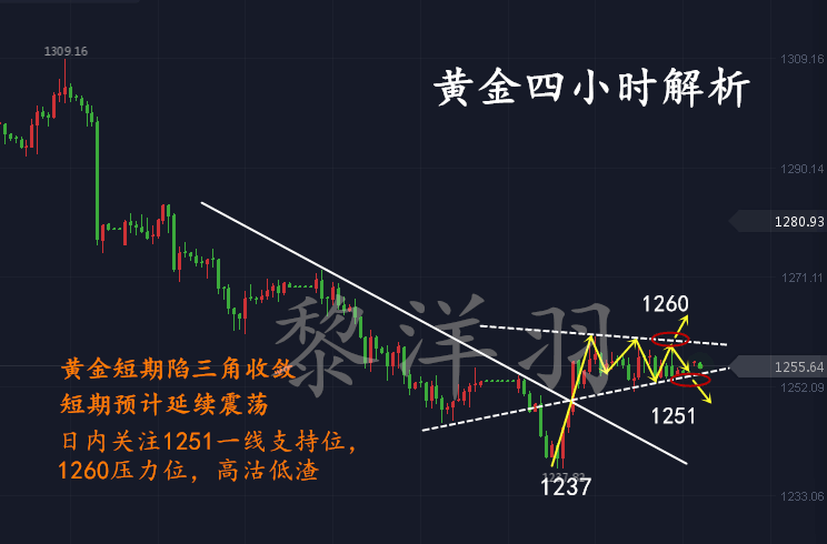 黎洋羽:黄金日线单阳难延续,美盘交易可先空一波 生命在于运动,交易不可冲动。时而懂得行动,莫要该动不动。例外恰恰证明了规章的合理性,最大的技术莫过于人心,急于翻本往往推向深渊,理性是一种自我的克制,更是一种成熟的表现,面对价格的波动冲动证明还在交易,过度的冲动只能证明还不会交易。各位朋友你们好,赠君一法决狐疑,不用钻龟与祝蓍,我是黎洋羽,但愿人长久。 =====亚盘急涨难延续,美盘黄金先空后多 亚盘急涨难延续,黄金上演了一次开盘拉升后的慢跌,黄金强势试探1260上方,但上行的区间相对较为有限。之后冲高欧盘小幅回测1255一线,再次测试1261之后回调,暂时处于1255附近呈窄幅震荡格局。早上