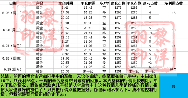 黎洋羽:黄金下周回撤多,总结交易经验单周即斩获56点! 市场充满了变数,却也充满了机遇,让哭的人止住了呜咽,让笑的人尖叫出声。重要的老师越来越少,但是留下来的我越来越重要,有什么好炫耀的,未来的自己正嘲笑着自己呢!这是一种进步和成长的表现。很多人不是不够聪明,而是不够成熟,很多人不是缺乏知识,而是缺乏经历,见过黑天鹅,等过震荡破,遇到瞬间涨,做过瀑布空,扛着逆势单,拿过中线多,还有什么好怕的!各位投资朋友周末好,赠君一法决狐疑,不用钻龟与祝蓍,我是黎洋羽,但愿人长久。 =====黄金空头将止,周一开盘回撤多 回顾上周,整体的金价以慢跌的形式下行,低点一度到达1245,其中黄金的行情也是一波三