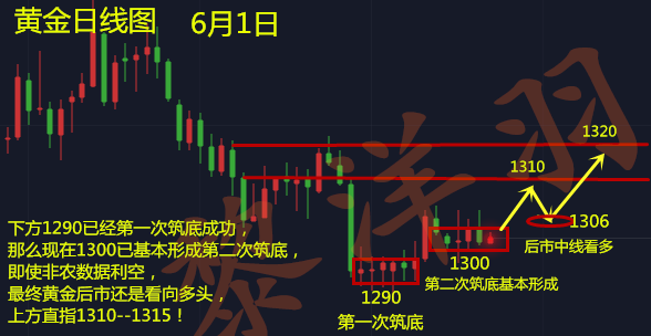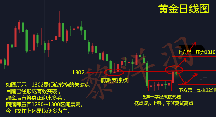 黎洋羽:周初弱势回调只是假象,黄金中线看涨1315! 洋羽寄语-- 投资不是一夜暴富,而是一朝一夕慢慢的积累的。亏亏赚赚才是行情,盈亏就像坐过山车,有高峰,也有低谷,这意味着,无论眼下是好是坏,都只是暂时的。各位投资朋友们,下午好,赠君一法决狐疑,不用钻龟与祝蓍,我是黎洋羽,但愿人长久,千里共赚钱。 金价1290分水岭,今日内逢低做多 黄金方面:第一要关注市场的避险,第二要关注美元的走势。美元铸顶阶段,中期看跌。利好黄金多头。避险更不用说了,时不时来一下的避险,也是提振。 日线图来看,之前1290已经第一次筑底成功,那么现在1300附近也连续4天震荡筑底,相信非农行情之后出现大阳也就顺理成章