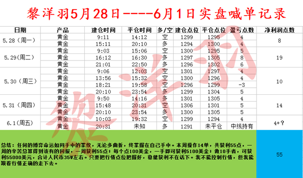 黎洋羽:6.3周评单周斩获55点,黄金中线布局请跟进目标1315! 洋羽寄语-- 没有完美的操作,也没有神准的策略!市场就是这样,变化多端,昨日暴跌暴涨的行情,今日黄金已然回归平静!说实在的,在黎洋羽的观念里,想要在这个市场中获取稳健的盈利,“成功=机遇+准备”这个公式必不可少!为什么呢?所谓时势造英雄,英雄造时势!各位投资朋友们,周末好,赠君一法决狐疑,不用钻龟与祝蓍,我是黎洋羽,但愿人长久。 畅游黄金市场!单周再次斩获55点! 一周交易结束了,在黄金市场上的投资情况感到满意吗?每到周末,洋羽都习惯对一周进行复盘,这让客户了结操作情况,同时自己也可以总结一周交易中的一些问题。回顾过去一周,