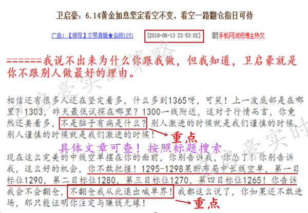 ======我说不出来为什么你跟我做,但我知道,卫启豪就是你不跟别人做最好的理由。 做投资最重要的两点:一是要懂得分析市场的一个行情;二是要懂得控制风险,作为一个投资者要有着良好的心态及正确的投资观念;积极的人在每一次忧患中都看到一个机会,而消极的人则在每个机会都看到某种忧患;面对剧烈波动的市场行情,我们要把握住每一个时机,把握住了机会也就等于把握住了明天! 作为投资人,一定要让自己变得专业,只有对金融市场专业了,才能清楚的认识市场。 ======日内精准抓取高低位完美获利 是马后炮还是真实实力?我不说,启豪也相信你心中自有天平!熟悉启豪的朋友知道,每一天的交易思路我都会在推送给关注启豪的朋