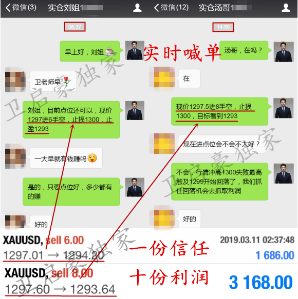 我的每一笔交易都是从实盘操作的角度出发,都要考虑到实盘跟随的可行性,不要看到统计的数字多么的漂亮,而是要看实际账户的最终盈利。投资需要看准趋势下手,做单先从大周期来看趋势,先看日线图在结合小时线来看,若是多头强势那么做单思路就是回调做多为,不要逆势操作去抓回调,回调利润空间有限,但风险非常大,操作以稳健为主。我从来不频繁喊单,从来不为了短线震荡来回的波动而忽略风险频繁交易,只有培养投资者良好的交易习惯和心态,才能做到最终的真正双赢。(文末见联系方式) 作为投资人,一定要让自己变得专业,只有对金融市场专业了,才能清楚的认识市场。 卫启豪每一单的思路都明确,绝不随意喊单,每一单都有理有据,让大家