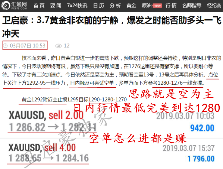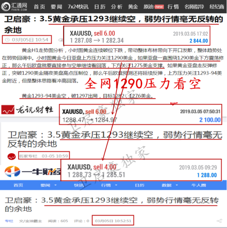 世上最欣慰的事,是重逢了曾经走失的自己。永远保持对交易的热情,去发现市场给予大家的指引。交易的乐趣,要自己创造。你我都一样,在找到合适的人之前,唯一需要做的,就是让自己足够的优秀。每个人都会累,没人能为你承担所有压力,人总是要让自己向前行。也许有的人对你不怀好意,会使你觉得这个市场充满了敌意。但事实并非如此,因为这个市场依然存在着积极的能量,只是你恰巧与其擦肩而过,又恰巧碰上了一根电线杆而已。 作为投资人,一定要让自己变得专业,只有对金融市场专业了,才能清楚的认识市场 早间启豪断言今日黄金1290触及即可空,空单在1289进场,午后果然小幅冲高1290,空单完美进场,而后黄金承压回落,完美跟