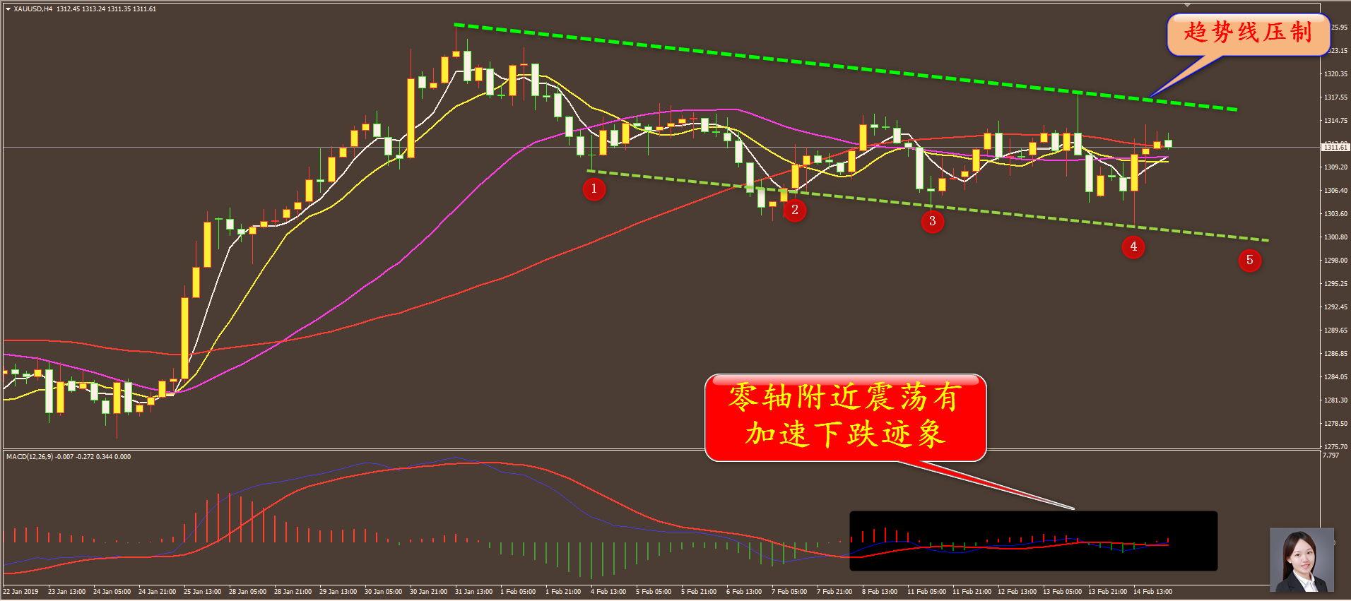 昨天黄金做了三单,多单在08.5获利出掉,10和13的空单持有,另外把早前1297.5的多单在1311平仓出局,获利14.5美金,老实说没有操作好,昨天留的两单今天再找机会出局吧,指标上我是在昨天看出有加速下跌的迹象,就不知今天主力的选择会如何,我们就拭目以待吧。另外、外汇港股保持盈利,原油损失60点,这里就不细说了。 黄金策略分析:通过对黄金小时图解析得知,近期黄金一路震荡调整,顶底逐步下移,,目前上方受到下降趋势线的压制以及60日均线的压制,macd在零轴附近震荡,并且上攻动能偏弱,说明行情有进一步加速下跌动作,在操作上建议逢高做空为主,做多为辅,具体建议如下: 短期:1.黄金1313和