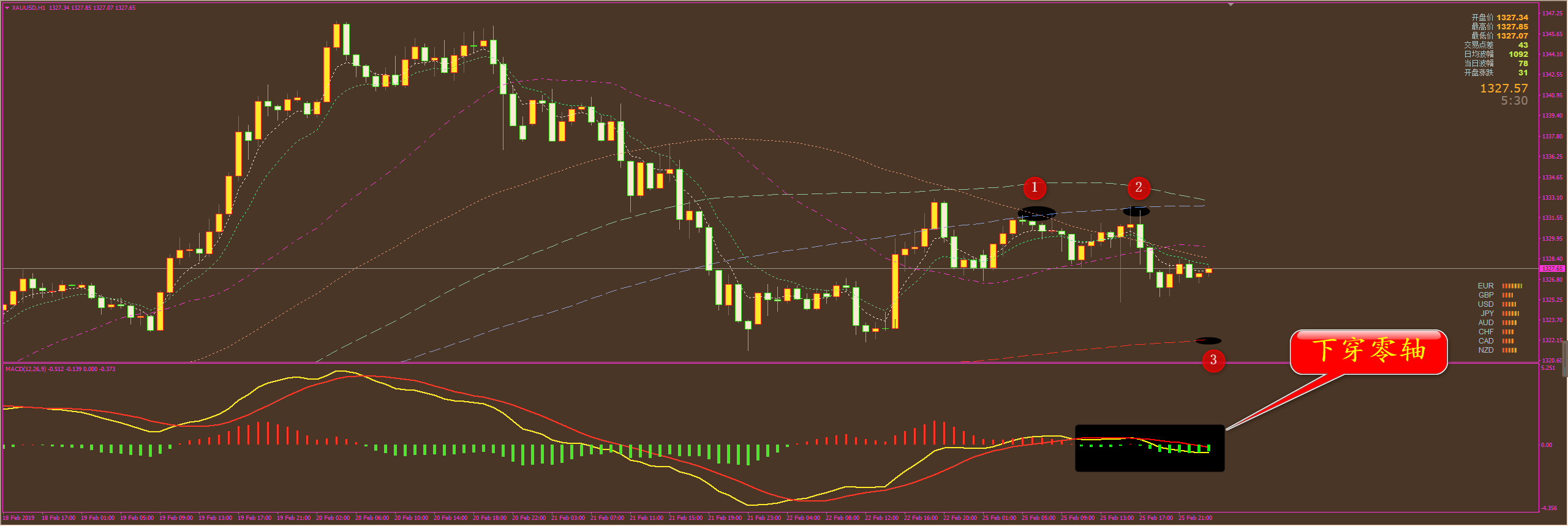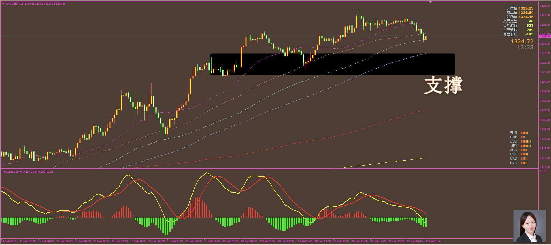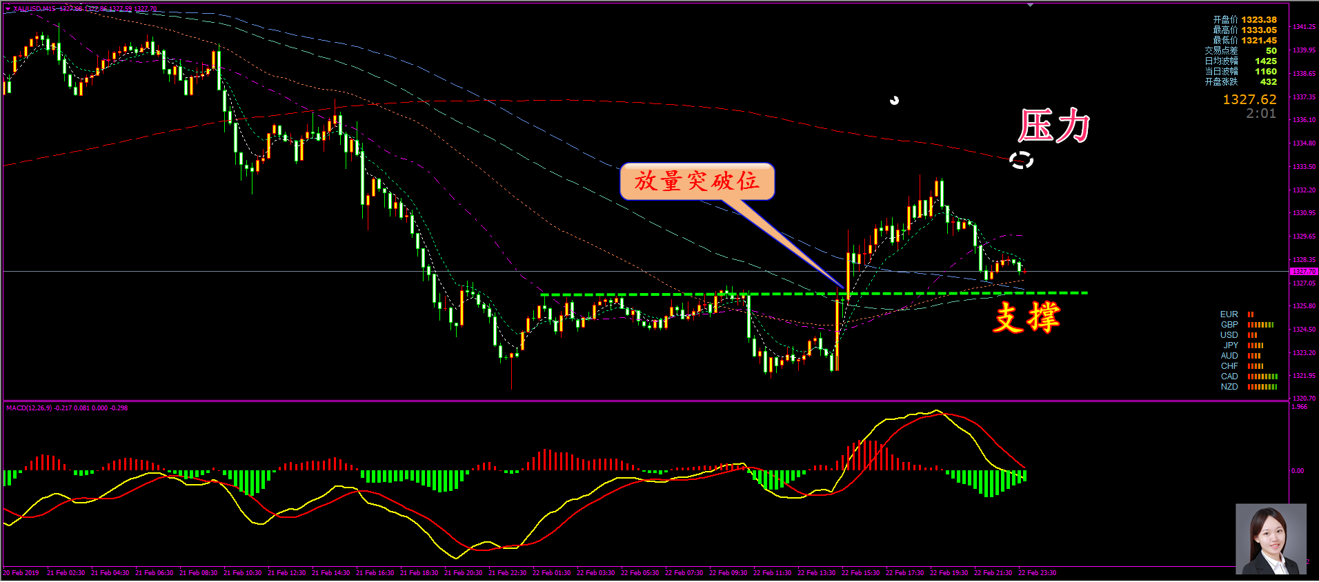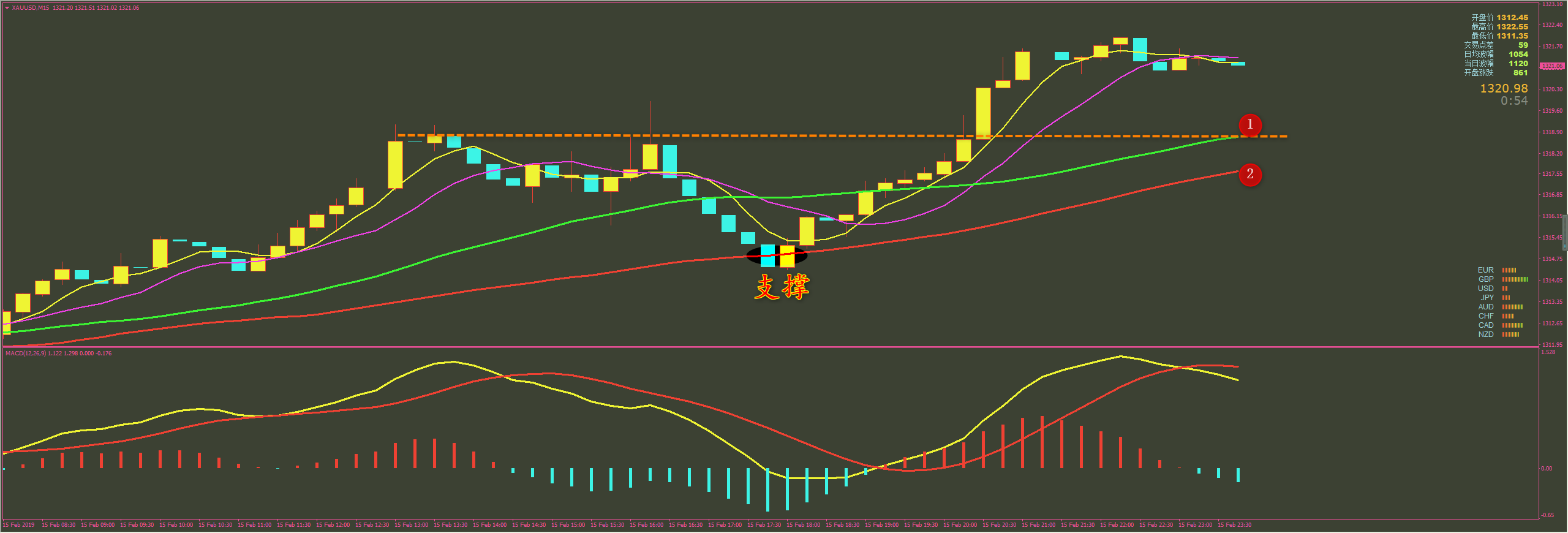 家人们好,上星期五我们黄金拿了13美金利润,还有一个1322.5的多单在手,其他几个品种没有留单,我看到有家人们还有原油的多单没舍得出来,这里希望大家都跟上我的止盈止损节奏,不要贪,交易每天都有几乎,跟我不用愁没有单做。 今天(2月25日)上午,我们黄金、恒指、外汇依旧盈利几波出来了,这个月我们的外汇的准确率已经达到95%以上,快赶上我黄金恒指的准确率了,原油没算,估计也有91%以上。 方萍萍黄金策略分析: 通过对黄金15图解析得知,在上一个交易日在底部位置构成了小双底,晚间放量突破区间盘整,反弹至前期的底部位置冲高回落,目前即将到达下方突破位,相对来说有一定的支撑,macd能量柱也有所缩短
