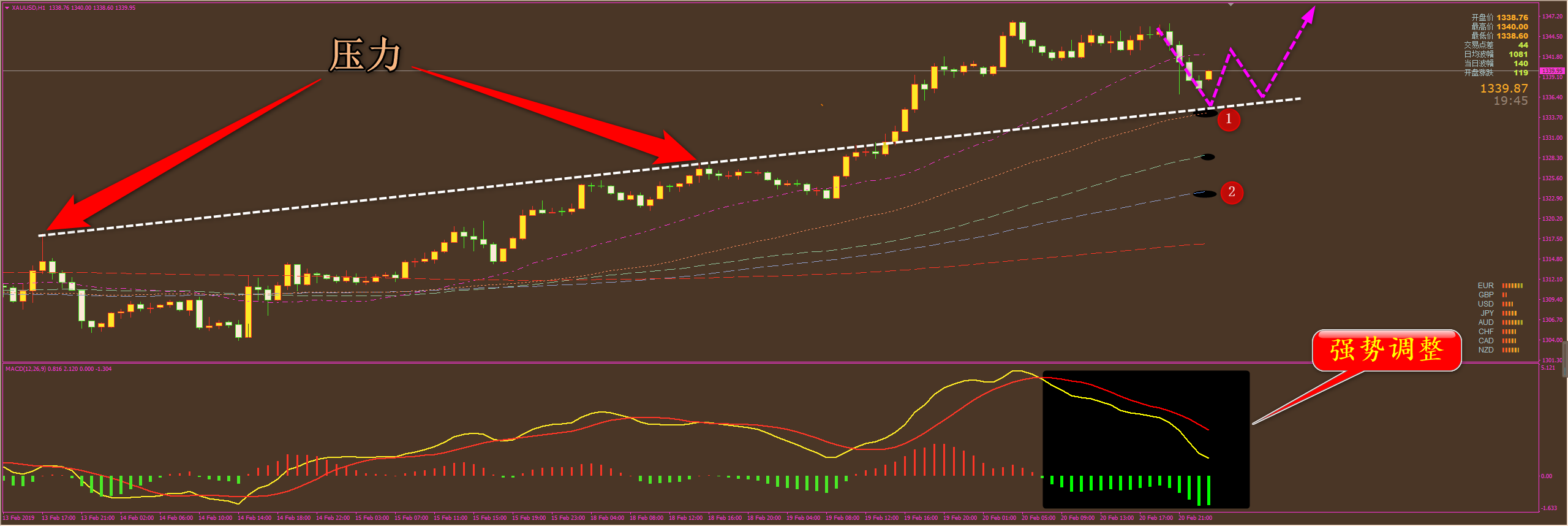 家人们好!昨日萍萍专门给家人提示过,小心黄金短期有小幅调整迹象,最终果不其然,行情与我预料的不差,金价如期回调......而我们也赢得了13.5美金的利润,原油也是一样的,大赚3.02美金。但恒指小损25点,不然又是所有品种齐开花。 PS:还有最近外汇比较顺利,并且镑系这段时间动能挺足,今天就加个镑美的分析。当然近期能够持续全体开花,也是我更新了战法的原因,目前这一战法已经盈利1000点,朋友们要跟上节奏了。 方萍萍黄金策略分析: 通过对黄金小时图解析得知,凌晨受到美联储加息影响,行情冲高回落,目前跌破了30日均线支撑,macd仍然开口向下,不过依然保持在强势区运作,属于强势调整,我们等回落