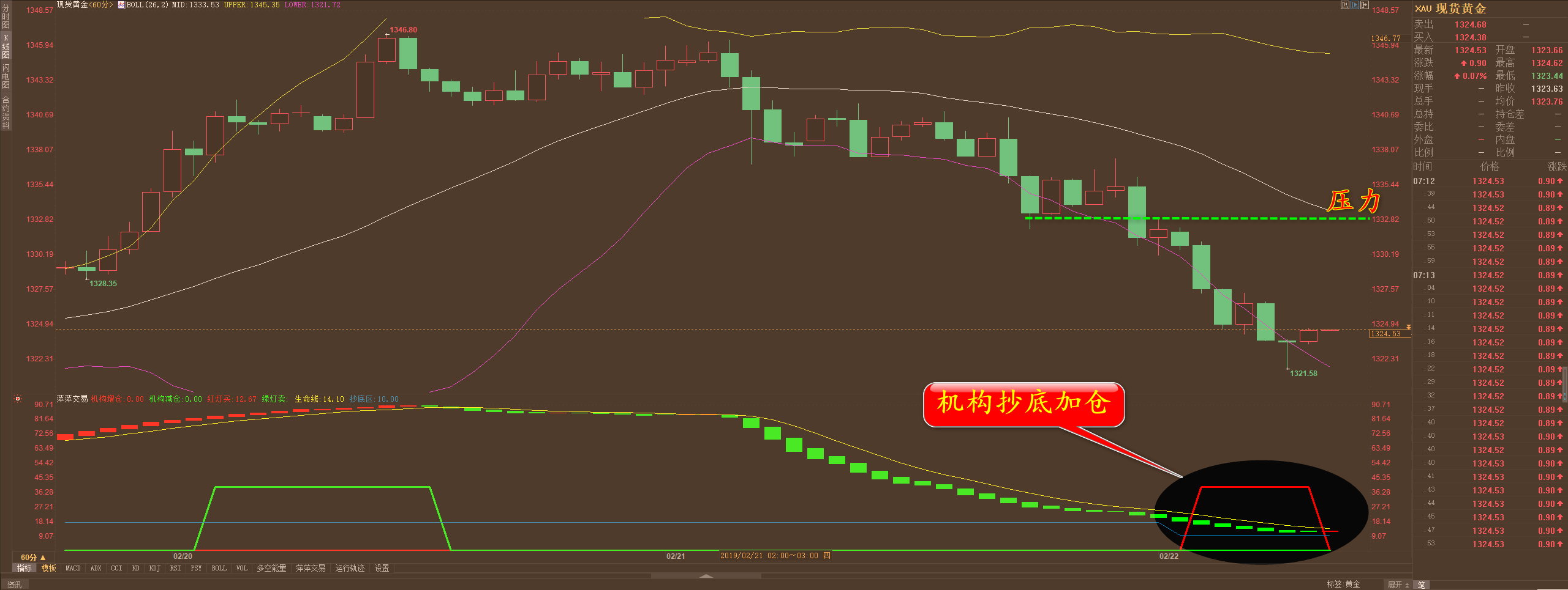 家人们好!自从我更新了战法后,之前两个多月相对比较一般的外汇是大放光彩,昨天自动扫止盈的就有好几单,手上还有欧纽的1.65多单持有,黄金昨天在1323.5抄底的多单减仓持有,原油黄金分别盈利4.5、0.37美金,恒指168点。 PS :本周外汇无一单亏损,平均每天盈利都在100点以上,我们的最新战法在本周发挥极大的作用,想要跟上操作的到客服那里领取我的战法资料。 方萍萍黄金策略分析:黄金在经过昨天的暴跌后,行情逐步企稳,市场多头主力也是蠢蠢欲动,我也可以慢慢放开手脚,相信今晚也能再次实现左右开弓,家人们只需注意好短信,跟上操作。 通过对黄金小时图解析得知,昨日黄金跌破布林带中规之后一路震荡下
