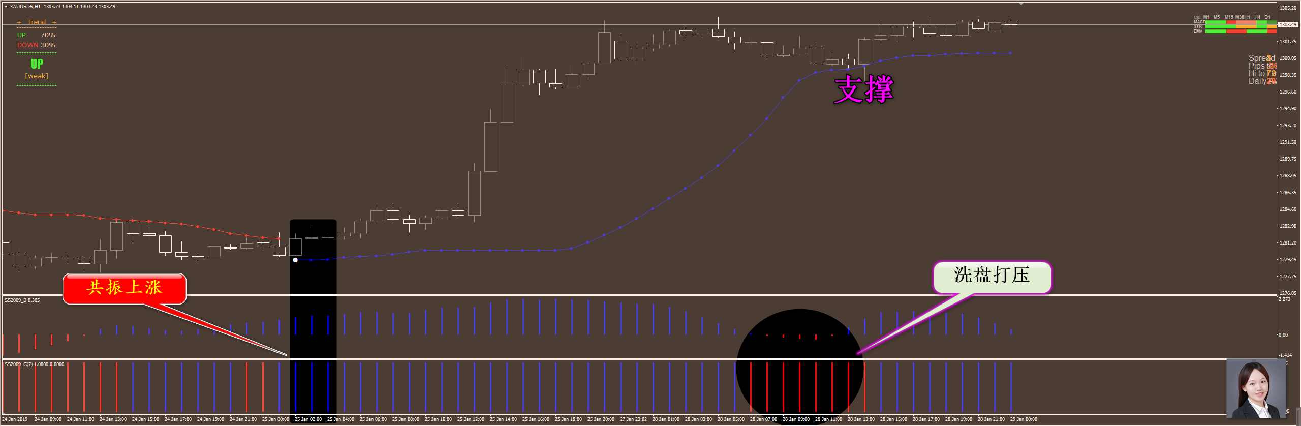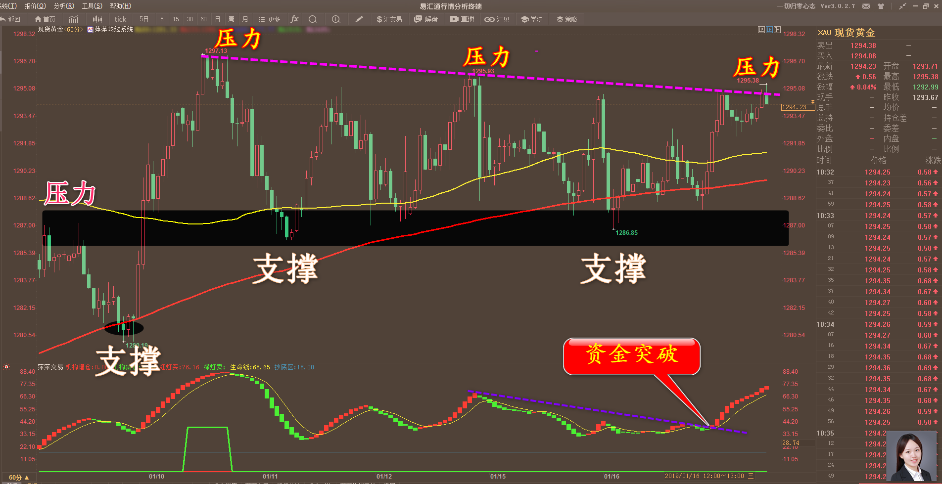 上周的时候我们就已经专门提醒所有家人美指暴跌,非美货币以及黄金白银即将上涨,所有行情完全符合我们的预期走势,不过我看着黄金突破压力后想抓一波回调的,结果主力直接突破了,做多意愿强烈,最后在回落至98左右全部止损出来,亏损6美金。 今天据我对黄金小时图解析得知,在上一个交易日主力一举突破前高的位置,说明多头意愿比较强烈,前期的高位的压力现在已经变为支撑,在操作上我们我们继续保持逢低做多思路不变,目前我们通过附图发现多头控盘力度减弱但仍然是高度控盘,我们等待进一步的反转信号,具体建议如下: 短期:1.黄金1295和1298分别做多,止损1291,止盈1309; 2.黄金1312做空,止损