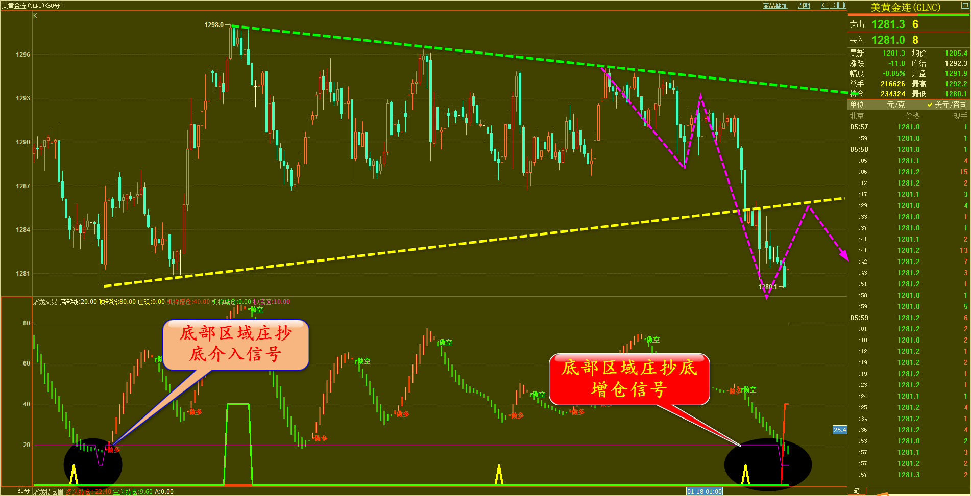 家人们好,上星期五做的不好,黄金原油全损,恒指跟天然气盈利,还有欧美1.1385的多单中长线持有。今天早上我也是一早起来,看到有行情就通知了大家,现在应该都盈利出局了,算是打了一个周一的开门红。下午欧盘后黄金的行情有了点变化,我短信也是编辑在手,到合适点位就会即刻通知,家人们要留意了。 先看黄金,通过对黄金小时图解析得知,前期行情到达底部位子出现了庄进仓信号形成一波强有力反弹上涨,近期几个交易日在1295一线受阻回落在上一个交易日继续震荡回落,目前再次回到前期底部位置再次出现了庄抄底和增仓信号,再通过近期几个交易日黄金ETF整体是处于增仓的动作预示行情将会进一步的上涨,目前重点关注上方128