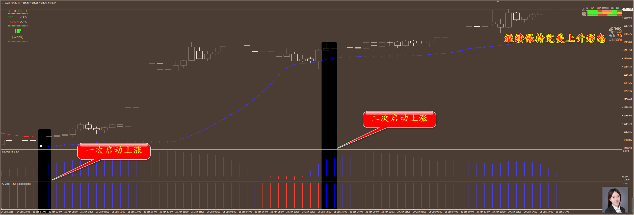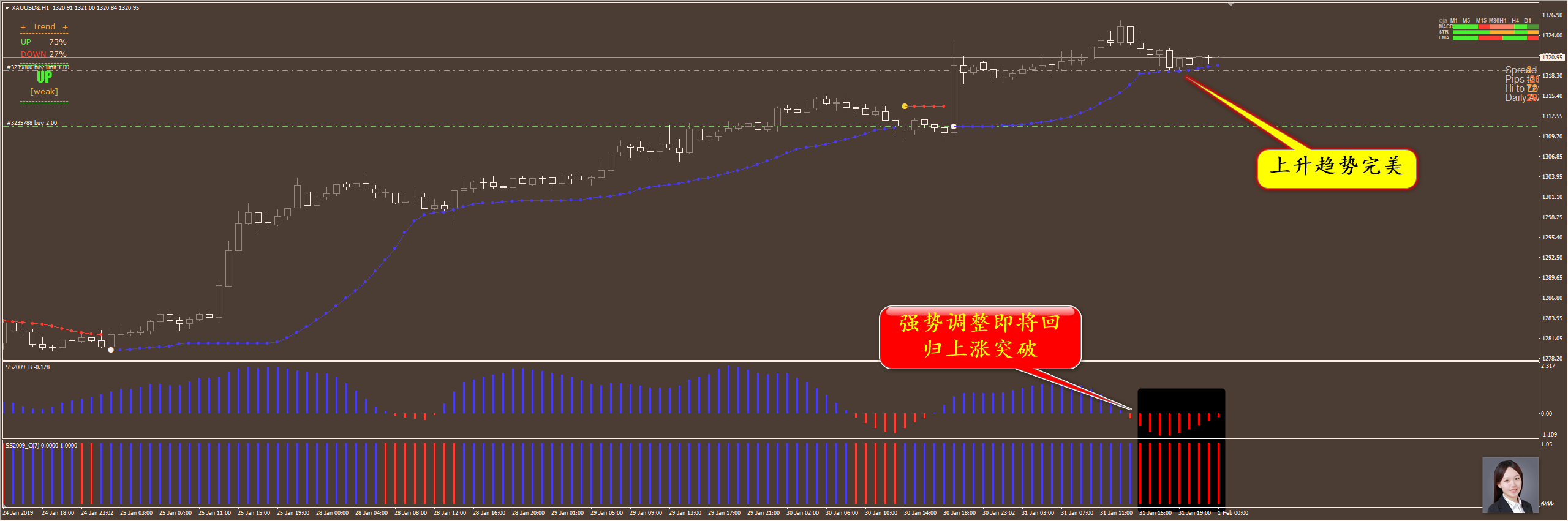家人们大家好,今晚我就要回家了,但是晚上的非农行情不容错过,我会坚持战斗,大家一定要留意我短信通知了,今晚战一波就要休息了,春节期间我可能也会给单,但就不一定按平常的规律了,给单前我也会先看下有没人在线,有的话就给。总之,方萍萍在这里祝大家新春快乐,财源广进,生活幸福! 昨天晚上我们两个挂单的自动止盈,多空全赚收获14美金利润,还有1297.5的多单持有;原油也是多空两开花,狂揽2.27美金;恒指赚131点;外汇欠缺,综合一天下来只盈利26点,不过欧美的1.133多单中长线持有。 来看黄金,在黄金小时图解析得知,目前依然是多头强势行情,昨日早间微调结束之后再次第三次放量启动上涨,目前短线即将