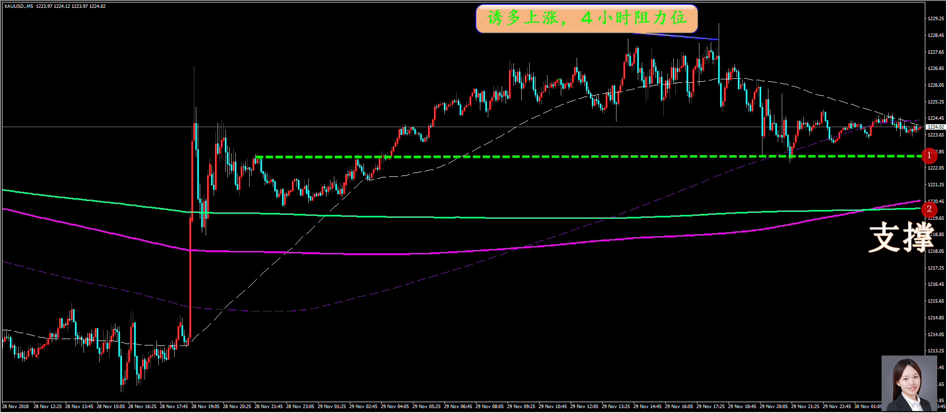 家人们好,昨天下午做黄金的多单我们在晚上获利减仓出来,想必到现在都能止盈了,其实昨天开始没想到星期一早上就有那么大的行情,以至于让我们早上的布局全部失效。今天就好多了,高开的幅度也比较正常,我们继续保持低吸高抛的思路,相信很快就能再爆发收割一波。 通过对黄金 5 分钟图解析得知,昨日跳空高开回落下方均线支撑突破重重阻力反弹上涨,目前行情已经形成了上升趋势, 1,2,3 号均线得到了强有力的支撑,对后期的上涨起着助推作用,在操作上我们建议逢低做多为主,做空为辅,具体建议如下: 短期: 1. 黄金 1227 和 1230 分别做多,止损 1224 ,止盈 1238; 2. 黄金 1240