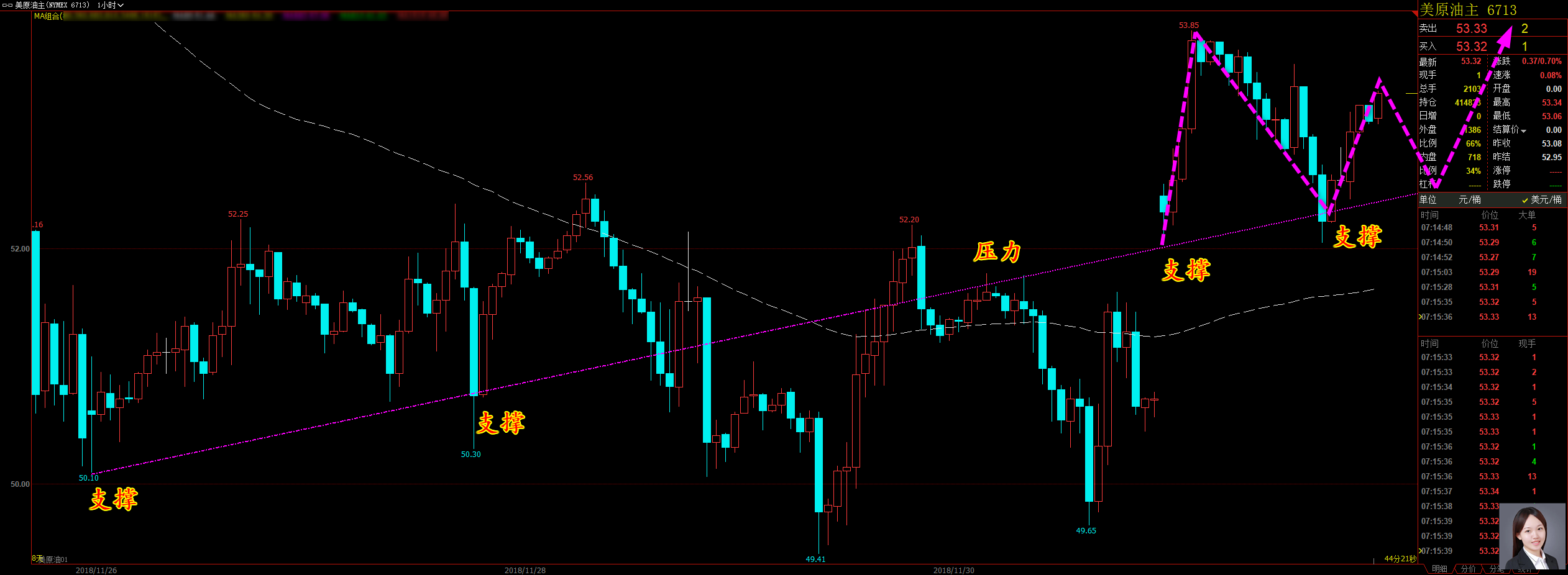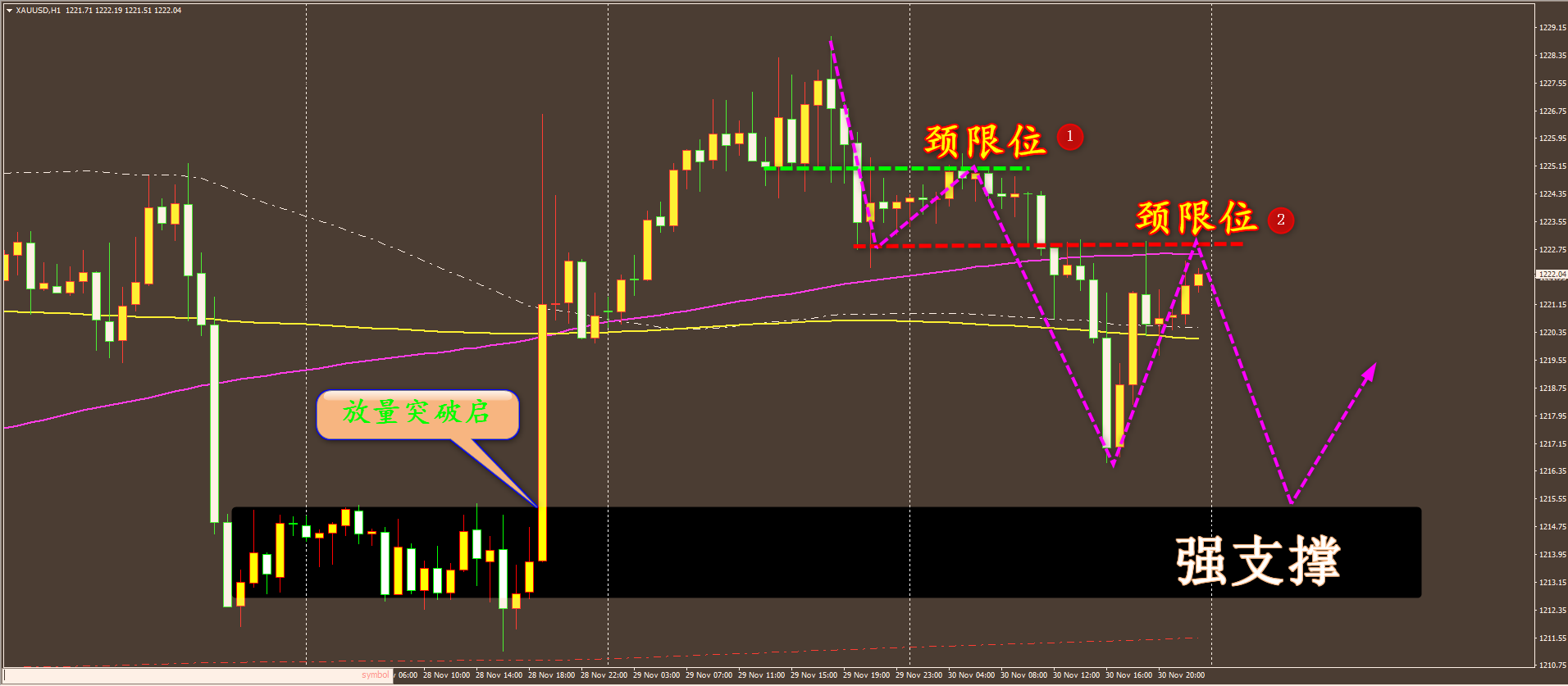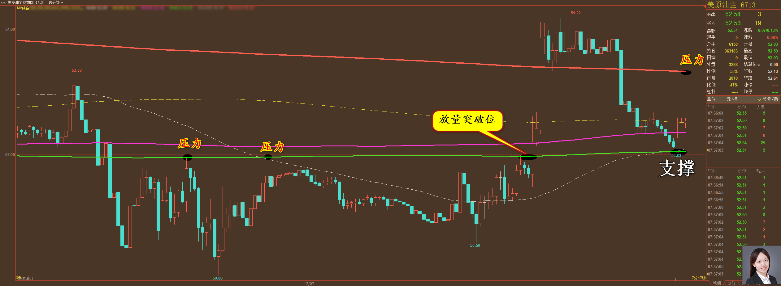 家人们好,昨天我们的盈利情况非常理想,黄金在昨天下午就已经实现了止盈,综合全天,累计获利整整 10 美金,原油的操作则更为精彩,在没有形成趋势之前,我就精准预测了市场主力的走向,那时候我通知大家杀进去,之后再度左右开弓,现在在还有 52.44 的多单持有的情况下,昨天盈利依然达到了惊人的 3.64 美金,均是实打实的实力所致。 通过对黄金 15 分钟图解析得知,昨日晚间在高位构成了三重顶,主力完成多空能量转换的动作,目前已经放量跌破颈限位,行情反弹至颈限位我们可继续逢高做空就好,预计将会到达下方 1,2 支撑位,在操作上我们继续保持高空低多思路,具体建议如下: 短期: 1. 黄金 1
