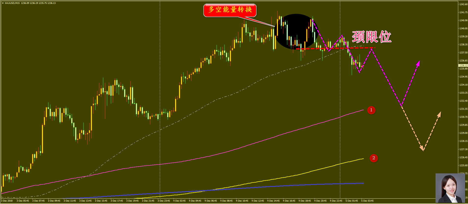 家人们好,昨天黄金我们一扫前天的阴霾,获利5.5美金,虽然没能完全回补前天亏损6美金的情况,但就像我之前多次保证的一样,我对自己的实力一直非常有信心,我也相信自己能在这个吃人不吐骨头的市场上持续带大家赚钱。 来看黄金,通过在日线级别解析得知,从前期反弹以来短期均线已经走强并且在近期已经得到了强有力的支撑目前受制于上方 1,2 号位置的强压力,在前期第一次反弹到 1 号线的时候出现了 50 美金的回调,预计在此也会受到压制,我们可在这里空一下,整体在操作上高空低多思路具体建议如下: 短期: 1. 黄金 1235 和 1238 分别做多,止损 1231 ,止盈 1248;