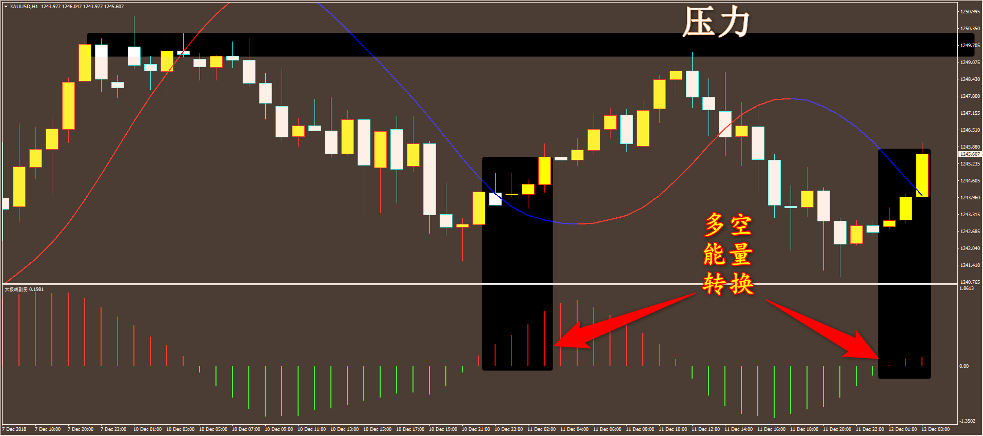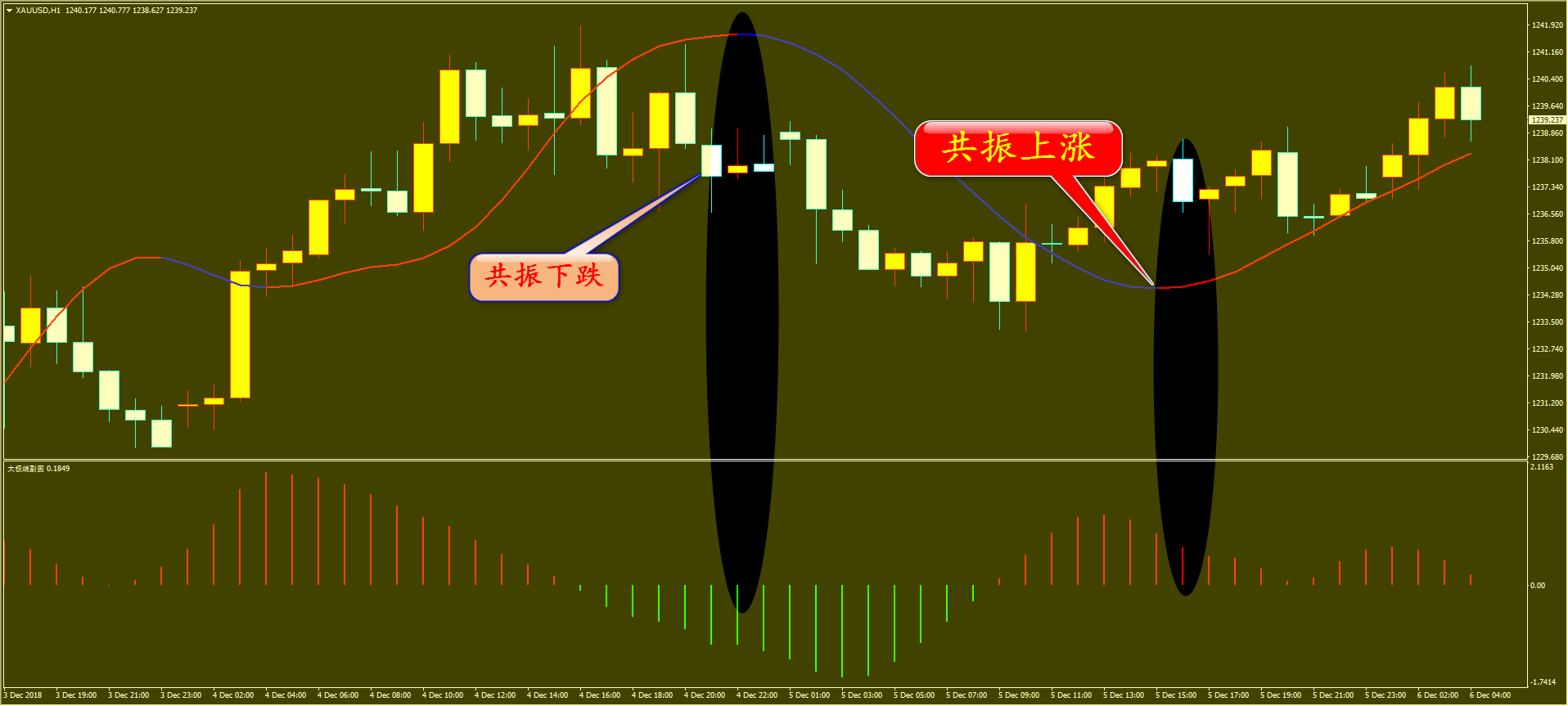 昨晚的行情没有我预想的那么大,可能也是因为美国假日的关系,我们昨天黄金外汇一天下来分别亏损 6 美金和 78 点,我也看到有家人在答疑里面跟我表述,请家人们放心,我还没有连续亏损过,上个月也就亏了两次,所以大家不必介意一天的损失,很快我们就能恢复盈利。除了黄金外汇,昨天我们原油还是大赚 4.25 美金,港股也有 246 点盈利,这里我也是希望大家安心,只要按我的仓位管理去操作,是不可能不赚钱的。 先看黄金,通过黄金小时图解析得知,前日我们通过太极主副图图看到形成共振下跌 (4 美金的跌幅 ) ,昨日形成了共振上涨 ( 目前已经有 5 美金的涨幅 ) ,目前虽然多头能量有所减弱,不过依