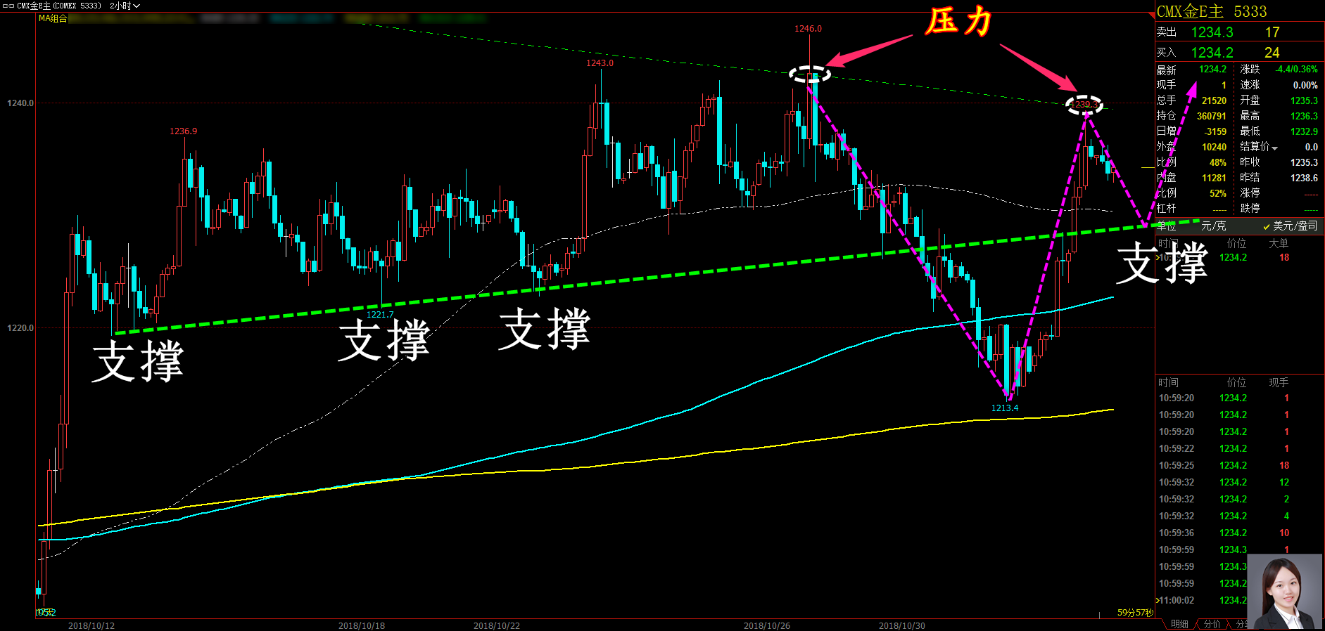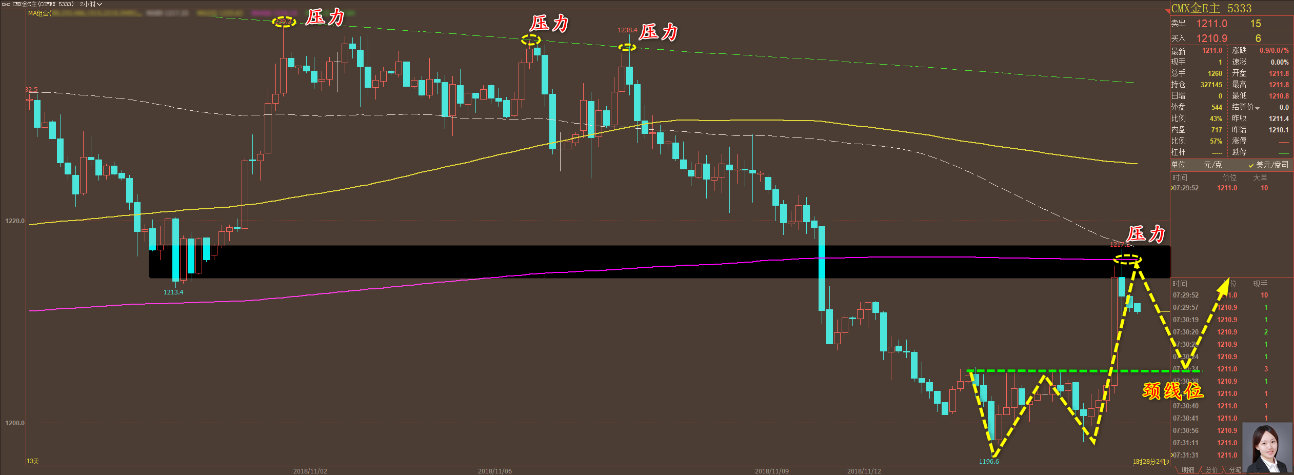 家人们好,昨晚的黄金真是心灵感应了,我睡觉 ( 其实也睡不太着 ) ,迷迷糊糊中梦到有行情,起来看到黄金暴涨,果断就想杀进去,于是就发了个信息看看有多少人在,结果信息一发出,就有 200 来人回应,那还等什么,果断空单 (1214 附近 ) 进场,最终斩获近 6 美金出来,加上昨天白盘的一点,周三累计获利 8.5 美金,现在想想还是挺刺激的。 今天黄金我们稍稍拖慢一点节奏,总之思路还是固定的,就是又回到之前的震荡行情了,我的把握也会越来越大。通过对黄金 2 小时图解析得知,前期行情一直受制于上方重要均线的压制冲高回落,目前到达下方支撑位触底反弹,昨日在底部震荡筑底 (W 底 ) 凌晨